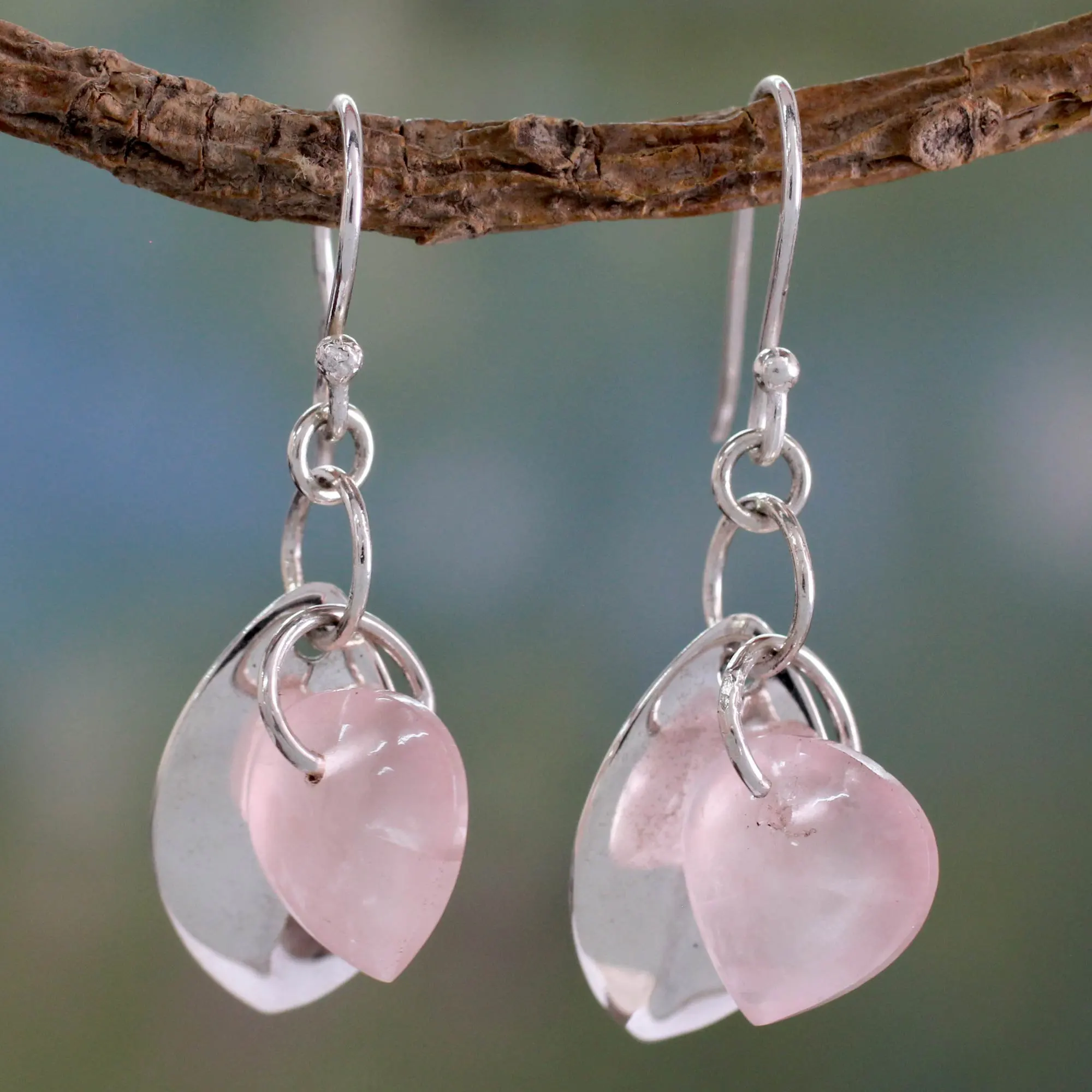 India's Bhavesh presents a dazzling pair of earrings with a leaf charm caressed by a gemstone dewdrop. The earrings are crafted of sterling silver featuring the mystical beauty of rose quartz, gem of romance.