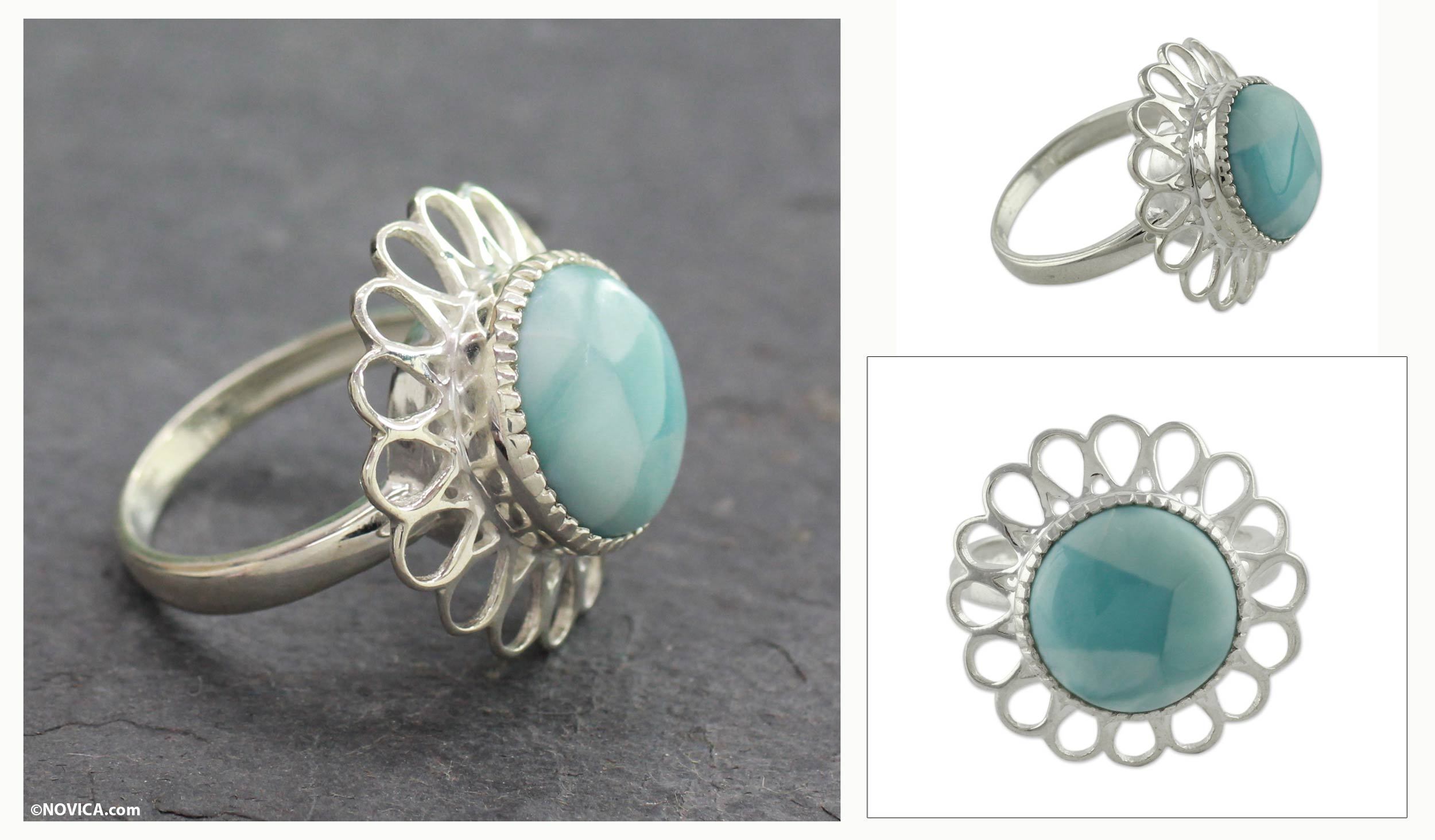 A sky-colored stone surrounded by delicate sterling silver petals. Crafted by Alok Jain from India, this ethereal ring's showcase stone is a wonderful specimen of blue larimar. This unique beauty will add mystery and enchantment to any jewelry collection.