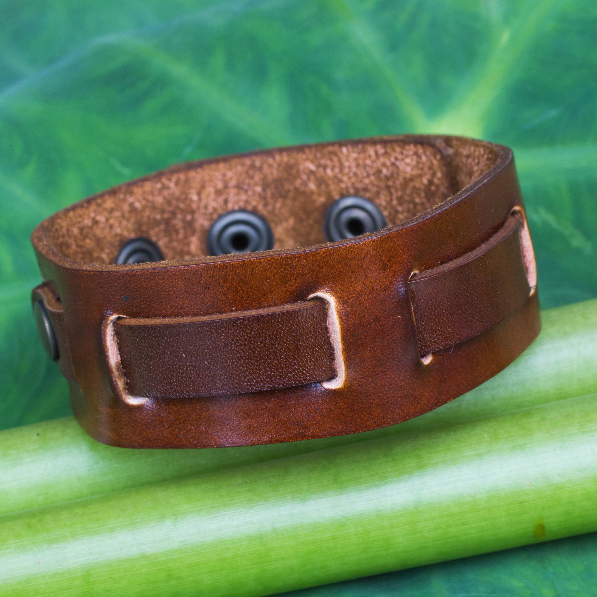 "A journey of a thousand miles must begin with a single step", according to Chinese poet and philosopher Lao Tzu. Show your adventurous spirit with this subtly rugged brown leather wristband bracelet. Thailand's Chaloemphon crafts the bracelet by hand, weaving a narrow belt of leather along the wider cuff. Brass snaps secure the bracelet at one of 3 lengths for a comfortable fit.