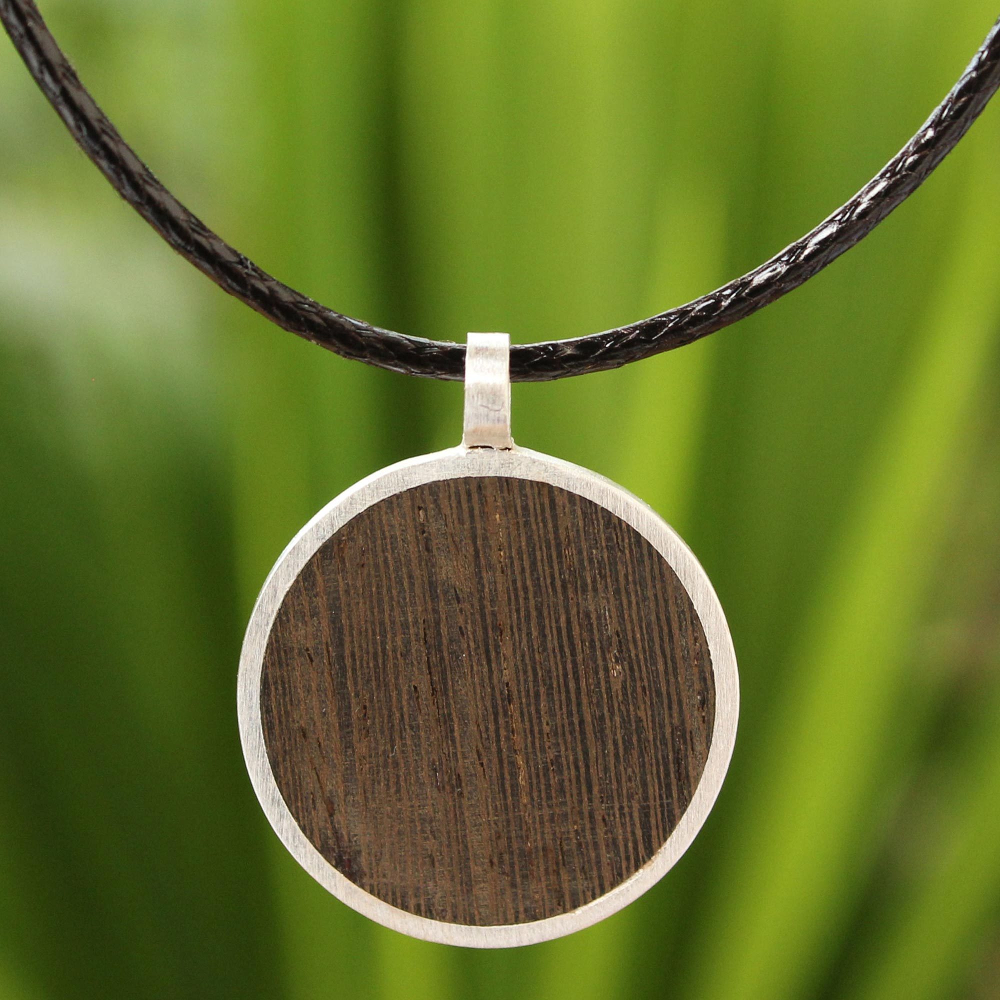 A disk of polished Indian elm with a beautiful linear grain is the star of this earthy piece. Sarote Lochotinunt from Thailand makes each necklace by hand, setting the wooden roundel into polished sterling silver with a braided black cotton cord. A modern and masculine design, this necklace makes a wonderful gift for the stylish man who loves connecting with nature.