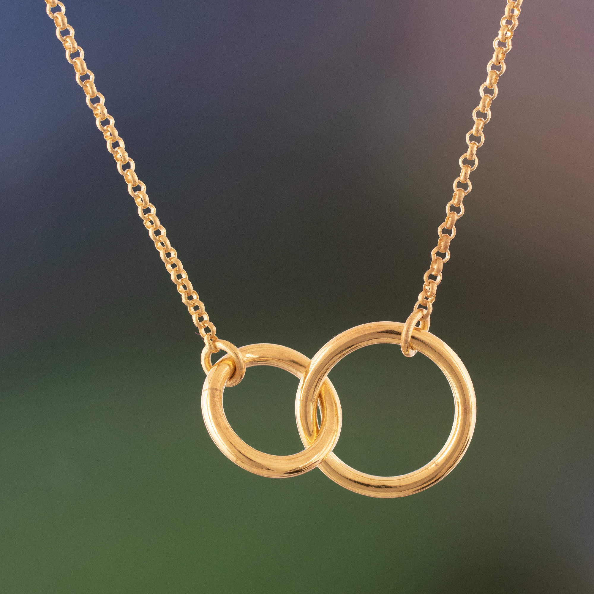 The eternal union between two hearts becomes tangible in this pendant necklace by artisan Adriana de Gadea from Peru. 18k gold-plated sterling silver composes this sublime accessory, displaying two joined rings in a high polish finish that illuminates with radiant grace.