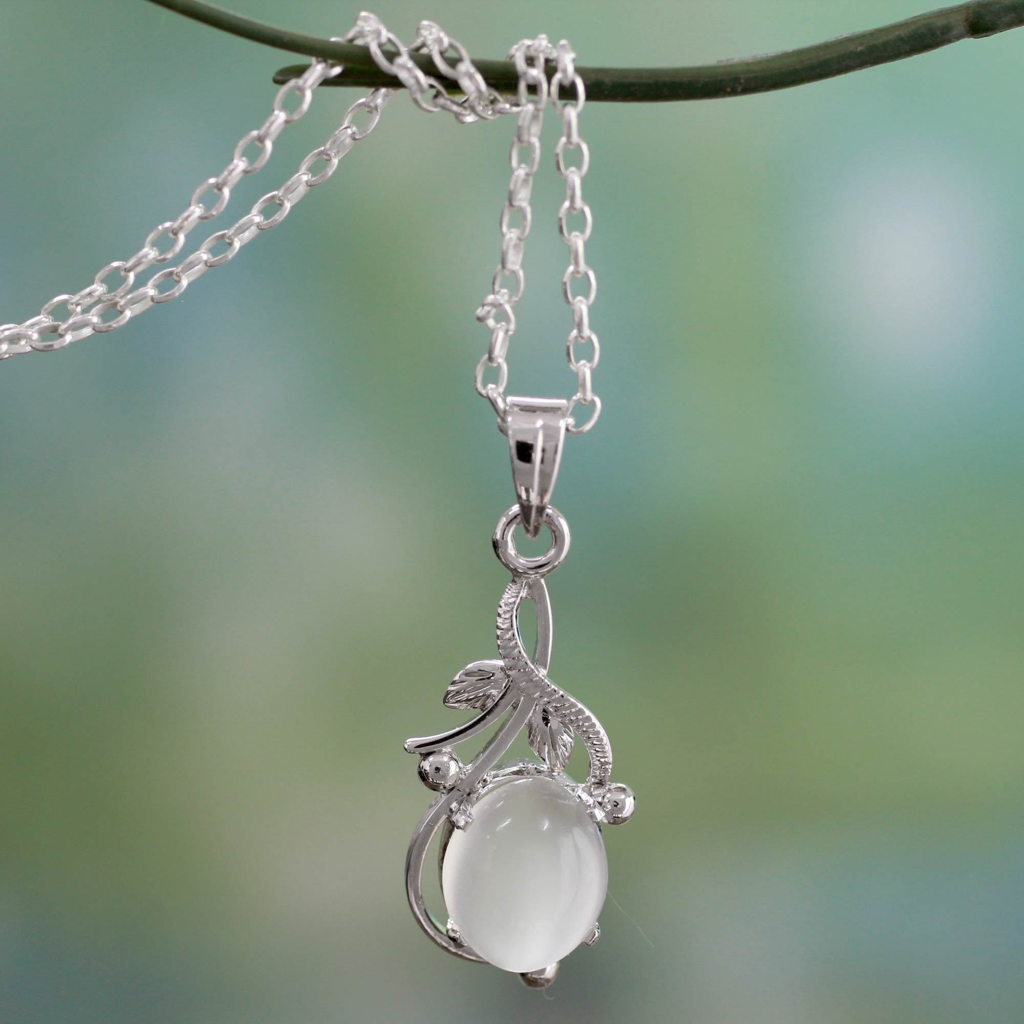 Leaves envelope moonstone's translucent glow in a necklace from Parul. Crafted of sterling silver, the luminous pendant is worn on a sleek chain.