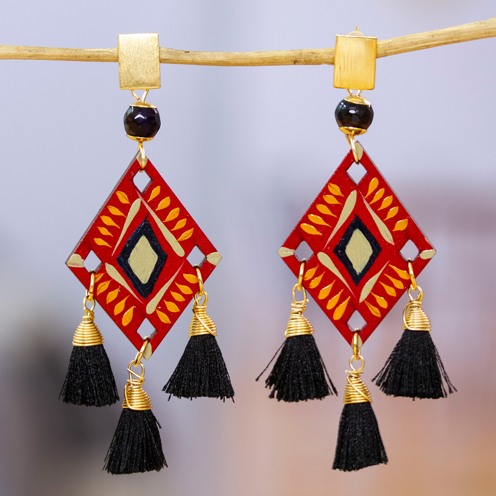 A palette of crimson and black hues evokes the burning beauty of fire around these chandelier earrings by Mexico's Alejandra Gallardo. Wood and 24k gold-plated brass accents compose this bold pair, inspired by the region's pre-Hispanic culture. To complete the design with a sublime touch, natural agate jewels and silk tassels adorn the top and bottom.