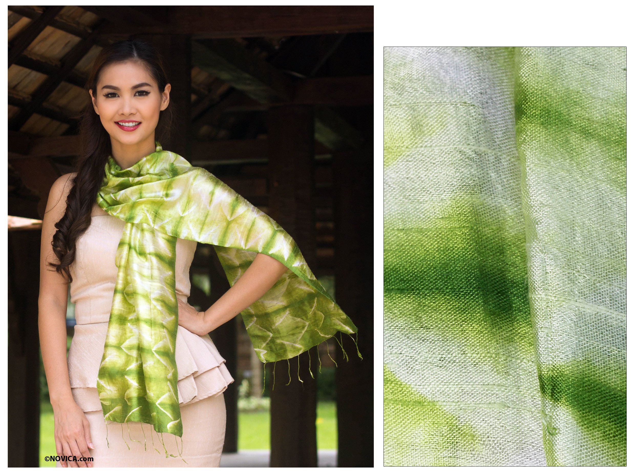 In lovely shades of chartreuse and white, an abstract vista of morning mist in a bamboo forest decorates this unique silk scarf. From Vinita of Thailand, finely handwoven silk is expertly decorated with tie-dyed motifs and finished with delicate fringe. A delight to behold, this scarf brings an air of the tropical rainforest to beautify your style.