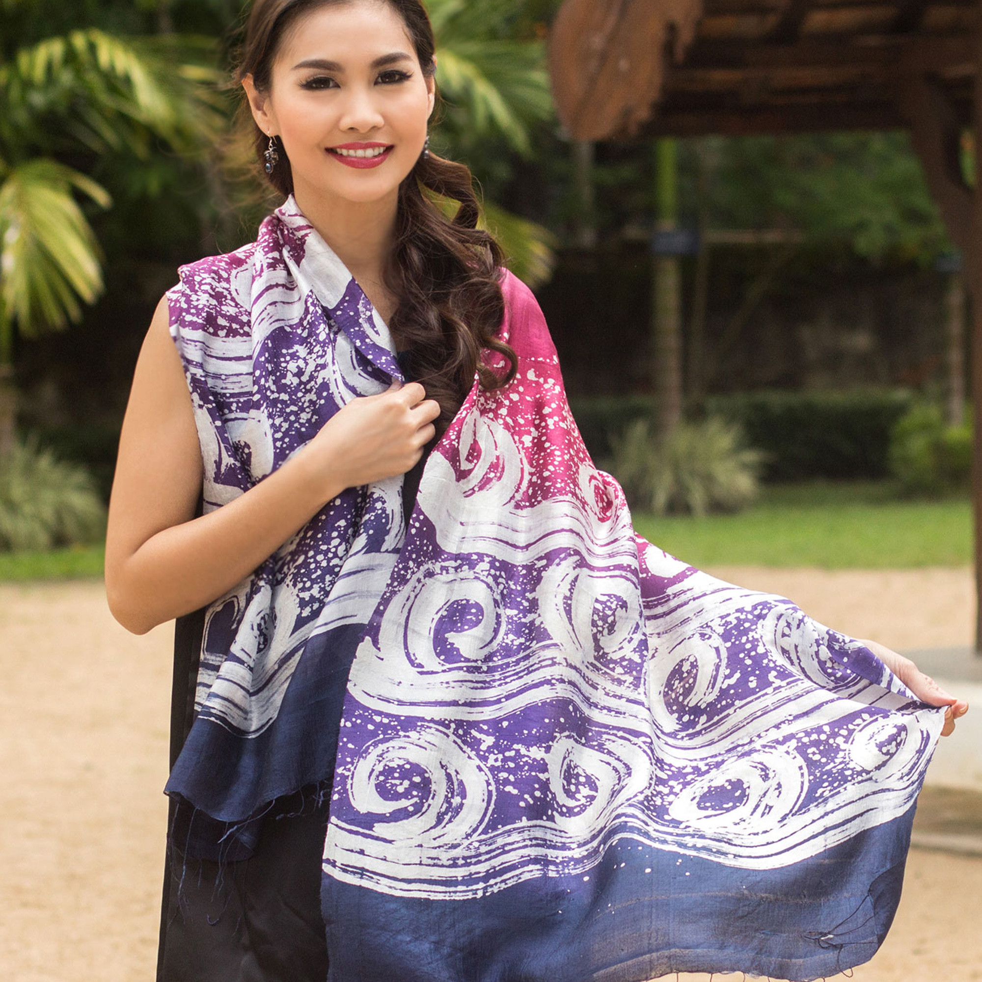 There's nothing in the world as luxurious as the feeling of real Thailand silk, as showcased in this women's shawl with all its vivid, touchable glory. Crafted by Thailand-based artist Vinita, it features hand-drawn batik designs of fireworks and swirls against a radiant background of graduated magenta and violet colors. Sure to become a go-to piece in your wardrobe, this shawl is versatile, comfortable, and ideal for any occasion, from a casual weekend to an opera event.