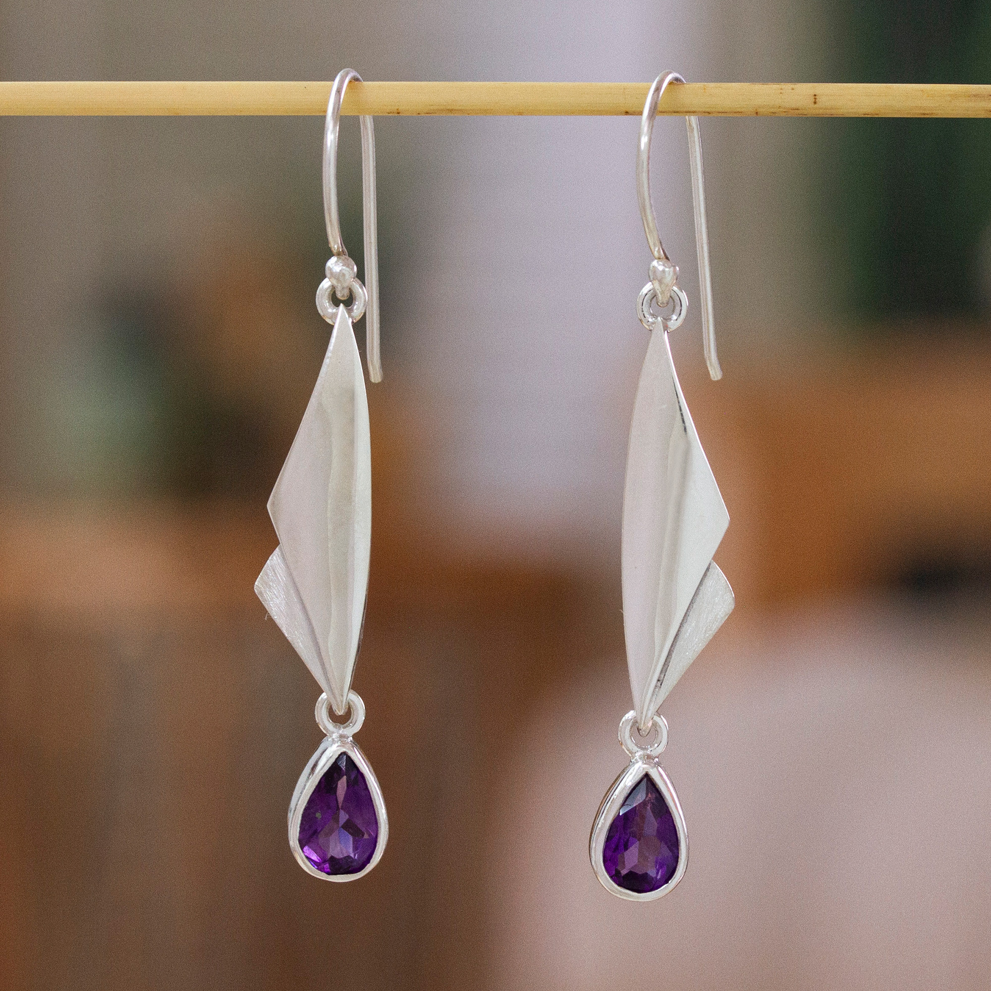 Like delicate dragon wings, the silver triangles ripple gracefully in these dangle earrings. Alon Diller in Mexico crafts the pair by hand, using fine Taxco silver and suspends glimmering amethyst teardrops underneath. Unique and evocative, these creative earrings are a perfect choice for any collection.