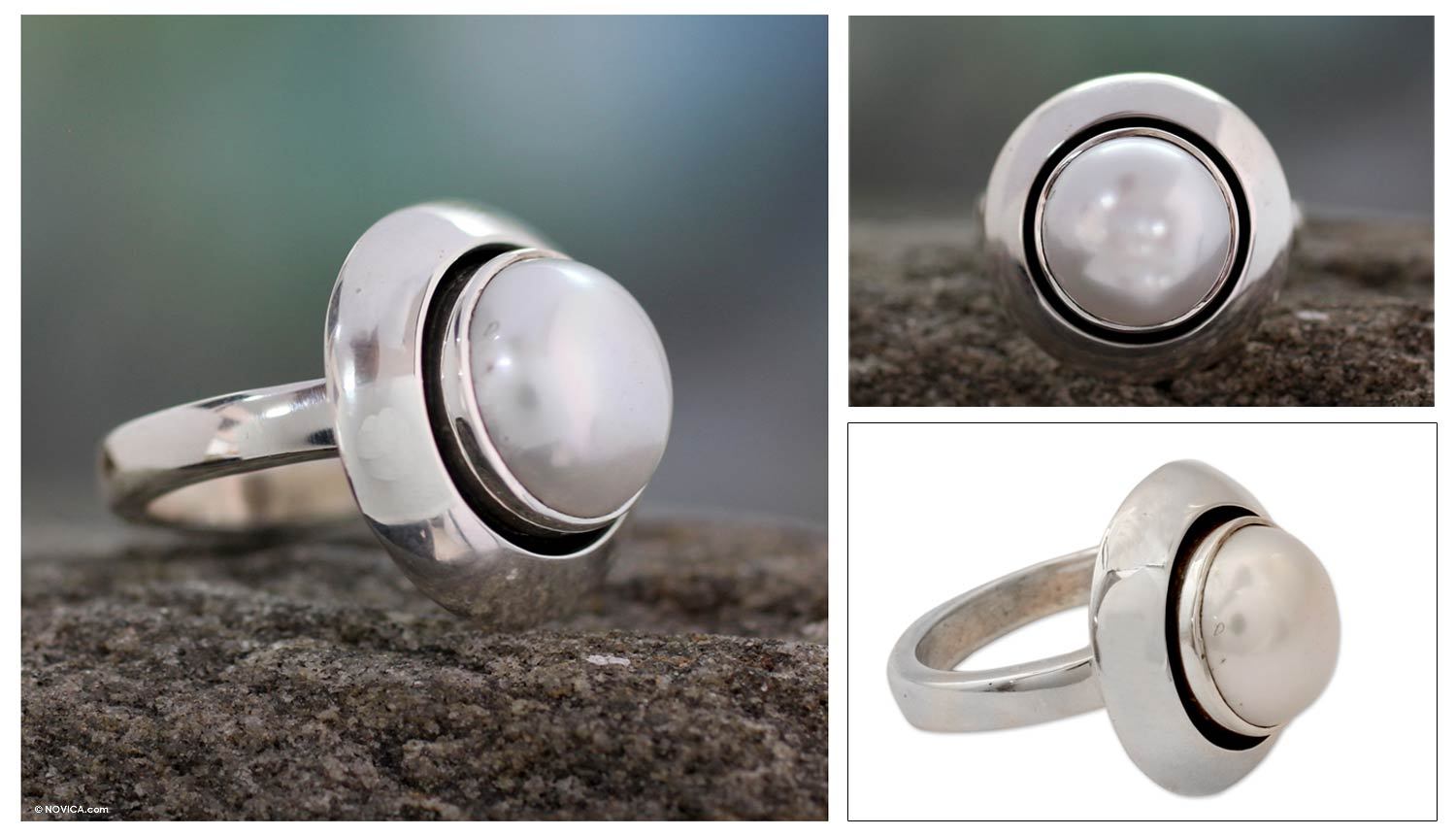 Beautify your hand with this white Mabe pearl ring from India. Created by Shanker, this stunning ring is skillfully handcrafted using .925 Sterling silver that surrounds the pearl giving it an illusory effect of a glowing full moon. This ring is sure to add an element of elegance to complement any occasion.