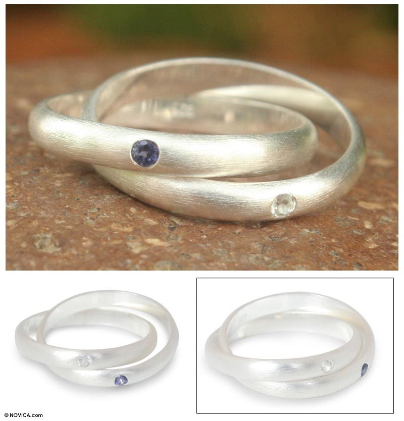 Jantana casts a spell of aesthetic elegance with the design of this ring. It is crafted by hand with sterling silver featuring a brushed matte finish. The interlocking rings are crowned with a gem each: one with a blue-violet iolite, said to unlock creativity within, and the other with white topaz, stone of truth and forgiveness.