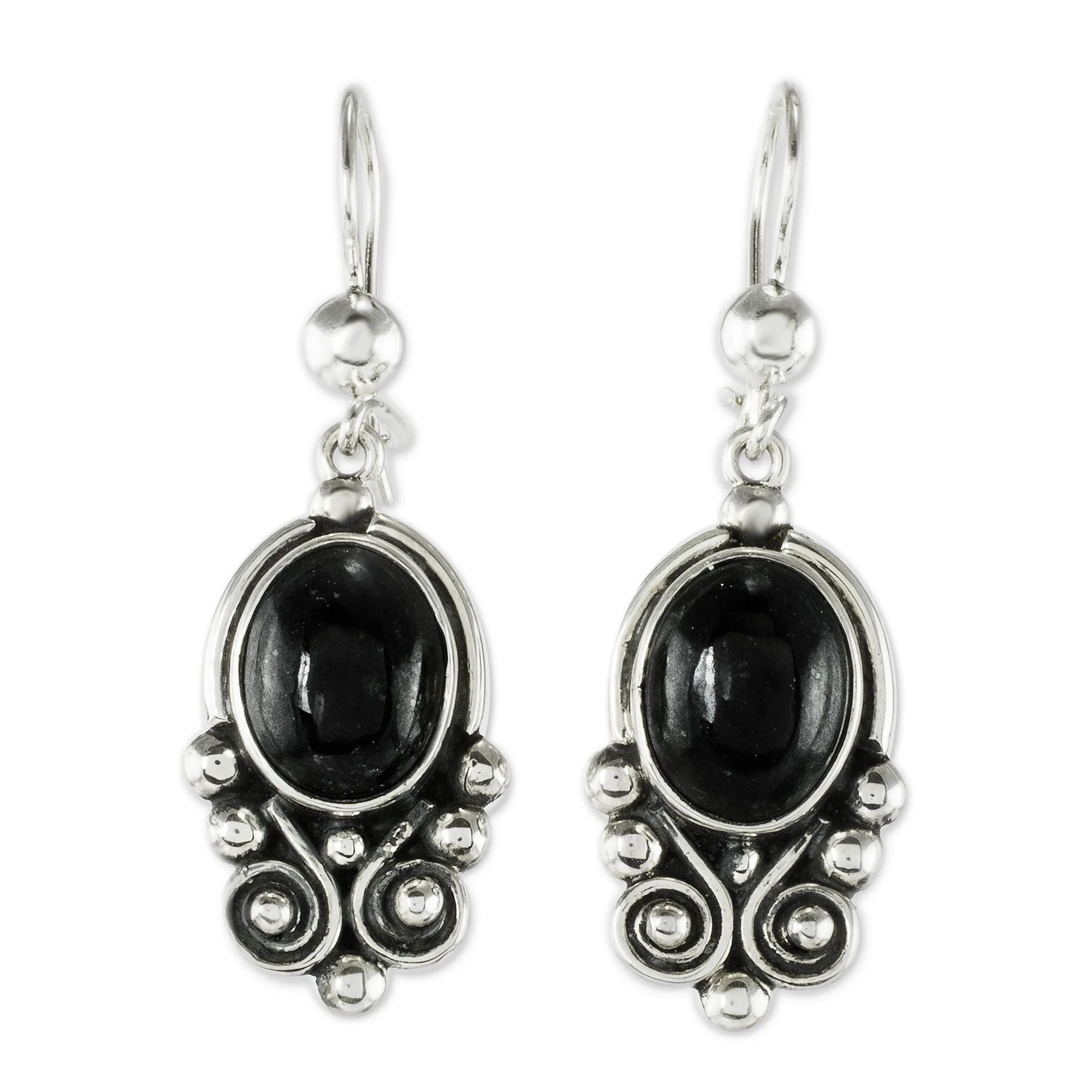 "This design is inspired by our eldest daughter, Saira Paola," say Pedro and Esperanza from the Jiménez Family. "It reflects her personality because she is conservative and elegant, with a touch of innovation. She never loses sight of her roots or sense of originality." The sterling silver earrings are crafted by hand featuring black spinel at the center of this loved design.