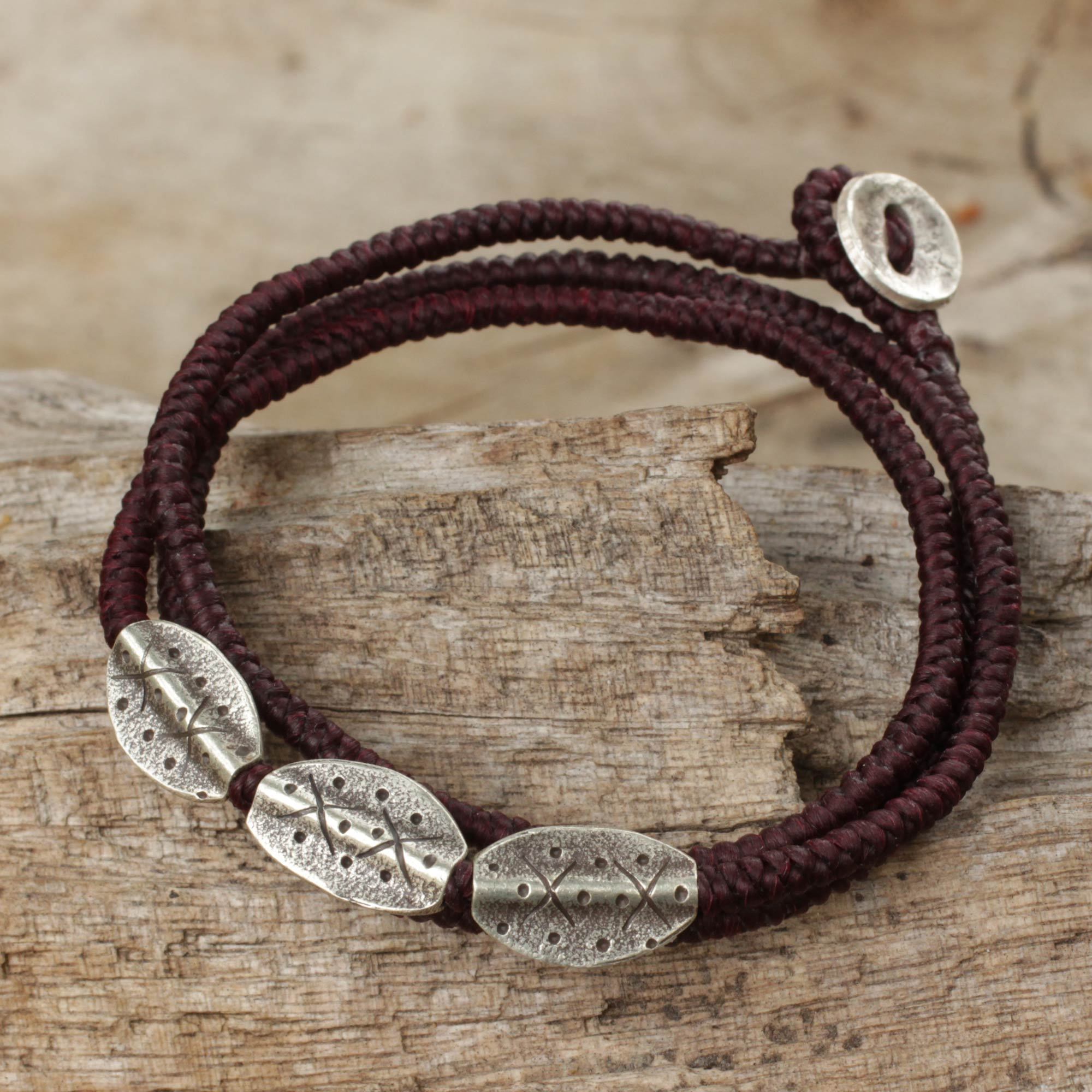 Artisan Napapat of Thailand presents a cord bracelet with minimalist hill tribe style. The deep brown cord bracelet wraps around the wrist and features Karen hill tribe oval silver beads with stamped patterns and an oxidized finish. The bracelet closes with a silver button.