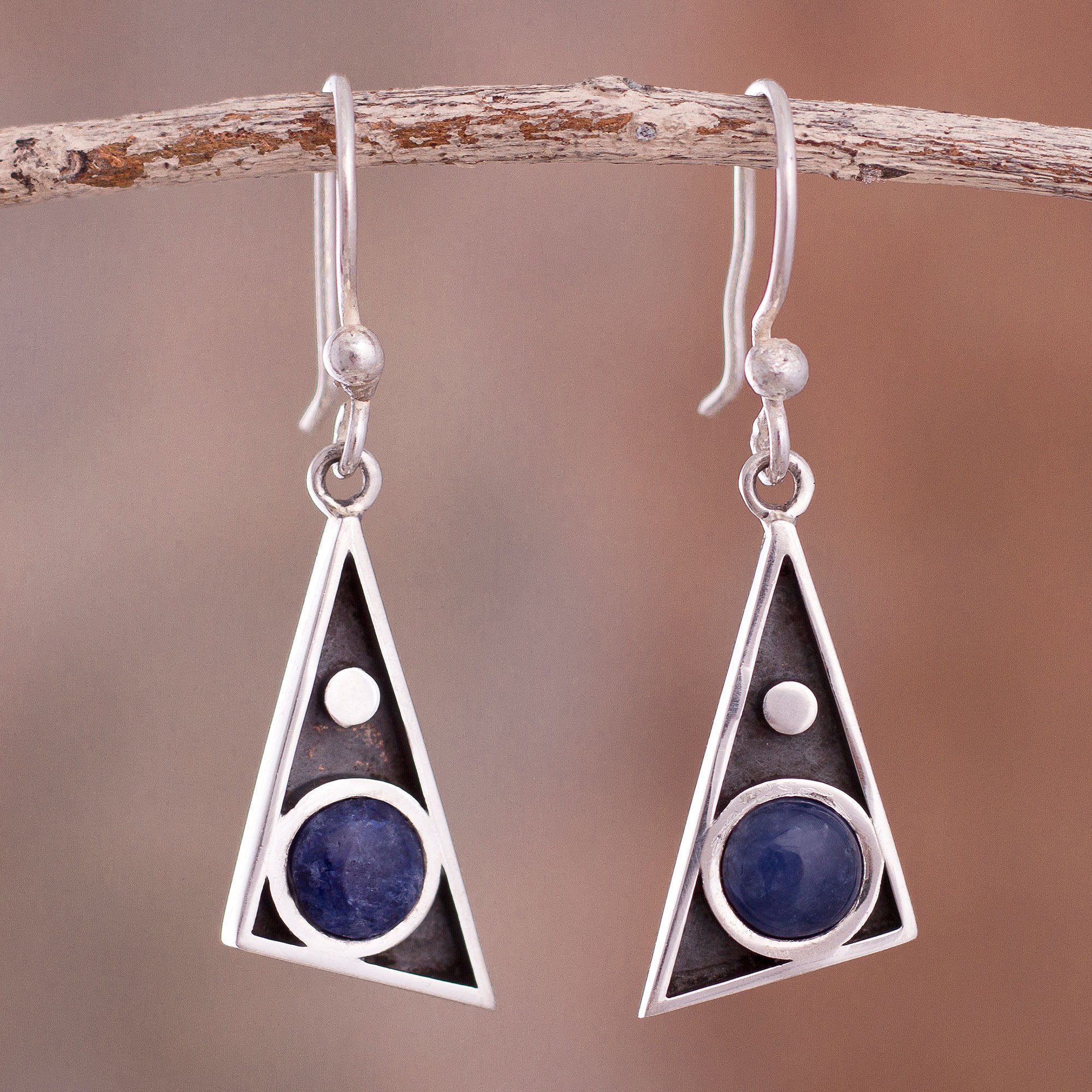 Framed by triangular shapes, these modern dangle earrings from Peru showcase cabochons of natural sodalite. Jael Serna designs this contemporary accessory; an oxidized finish contrasts with the brightly polished frames.