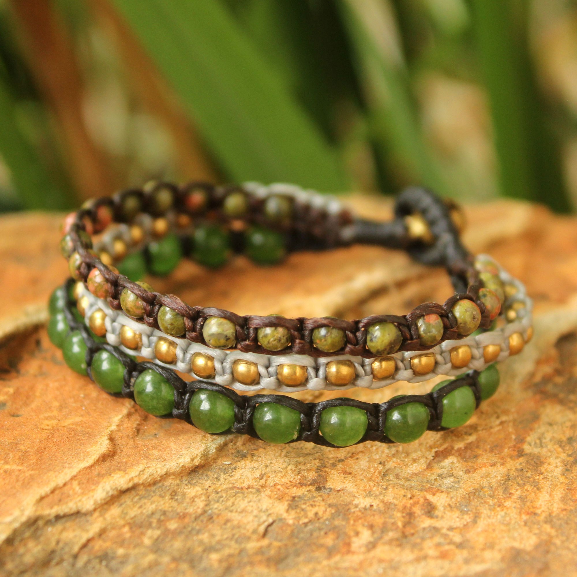Festive colors come together in a cheerful handcrafted bracelet. Knotted by hand, unakite, dyed quartz and bright brass beads combine beautifully in Tiraphan Hasub's design.