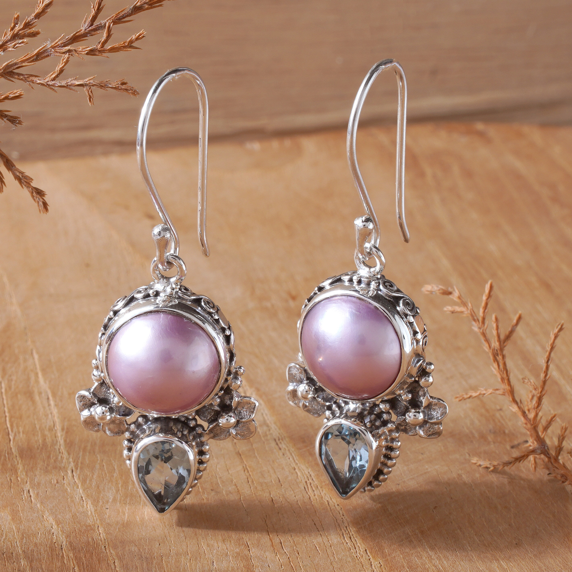 Shining gems unite the majestic moon and frangipani blooms with ethereal grace. Presented by Buana from Indonesia, soft, dyed pink pearls and 3 carats of blue topaz are framed in gleaming sterling silver to create these lovely earrings. Beautiful and feminine, this timeless pair complement with unmatched style.