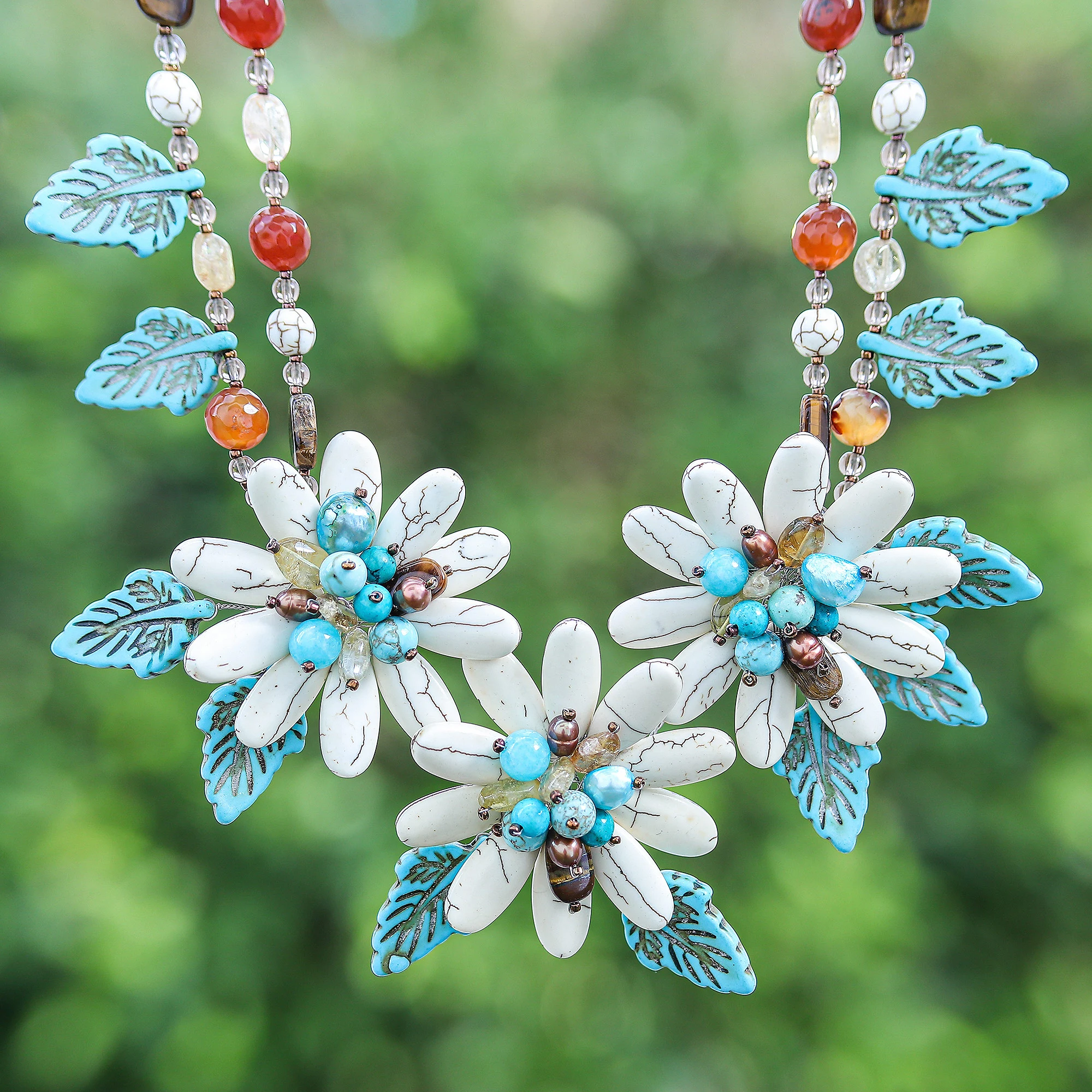 Winter makes a magical statement in Nareerat's newest necklace. Inspired by nature and fantasy themes, the bloom-shaped pendants and leaves that compose the accessory reunite howlite, chalcedony, tiger's eye, citrine, blue quartz and cultured pearls. Stainless steel wires held everything together, creating an ethereal illusion, whereas brass accents complete the piece with a touch of color.