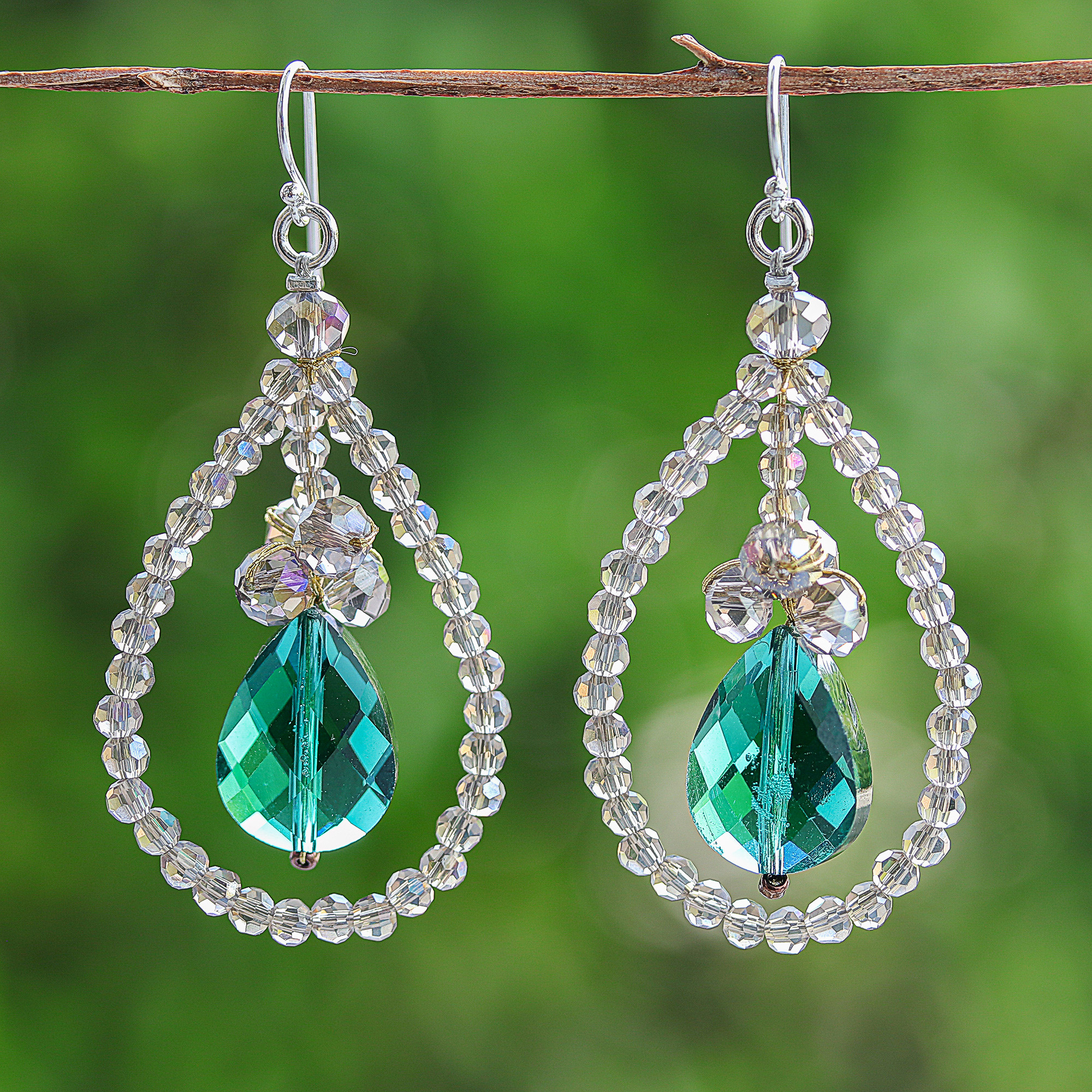 These dazzling earrings designed by Thai artisan Nareerat catch the light with their striking combination of smoky clear glass beads arranged in elegant teardrop shapes. At the center, a shimmering faceted green glass bead takes the spotlight, beautifully suspended from sterling silver hooks that bring a subtle gleam to the overall look.