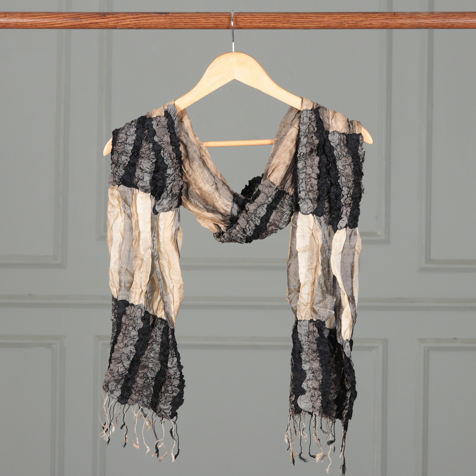 Fashionable Silk Scarf with Fringes and Textured Ruffles, 'Mystique Appeal'