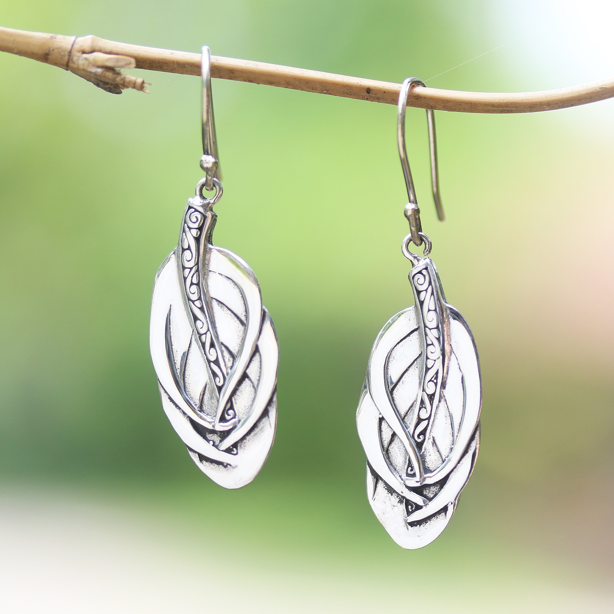 Shaped like elegant feathers, these dangle earrings are crafted from sterling silver, their spines detailed with spiral patterns. Balinese artisan Dewa Arimbawa creates these earrings, which are accented by a combination of finishes.