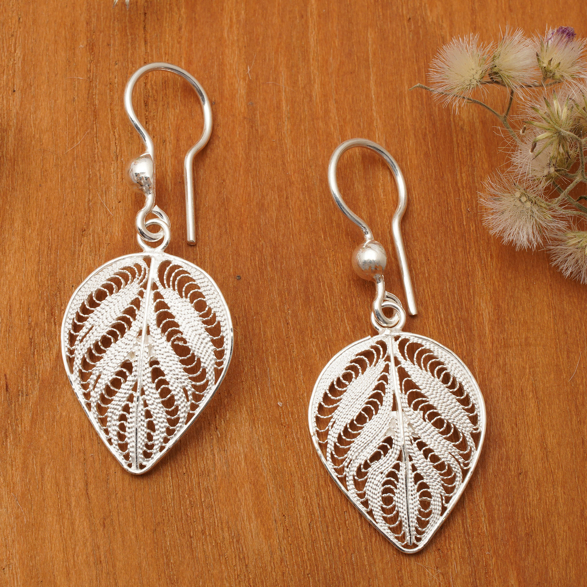 Filigree Matte-Finished Openwork Silver Leaf Earrings, 'Leafy Elegance'