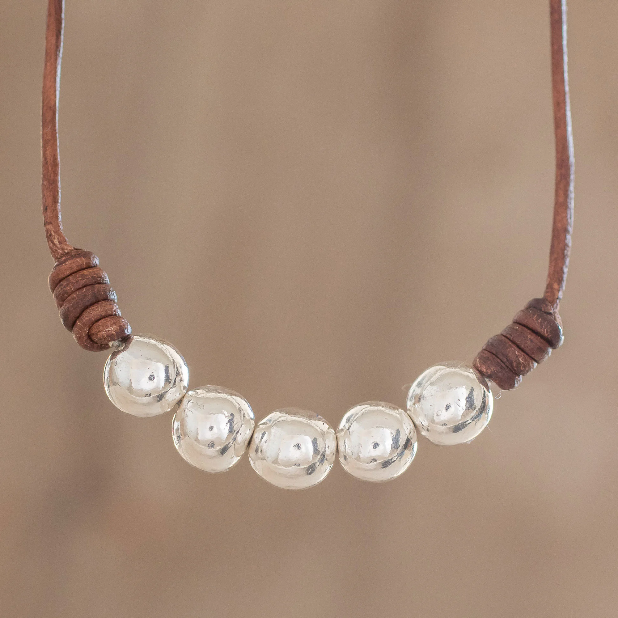 Five beads of shiny fine silver form the pendant of this necklace from Guatemala. Created by the Jalapa Girl Jewelsmiths, this necklace circles the neck with adjustable brown leather cord.