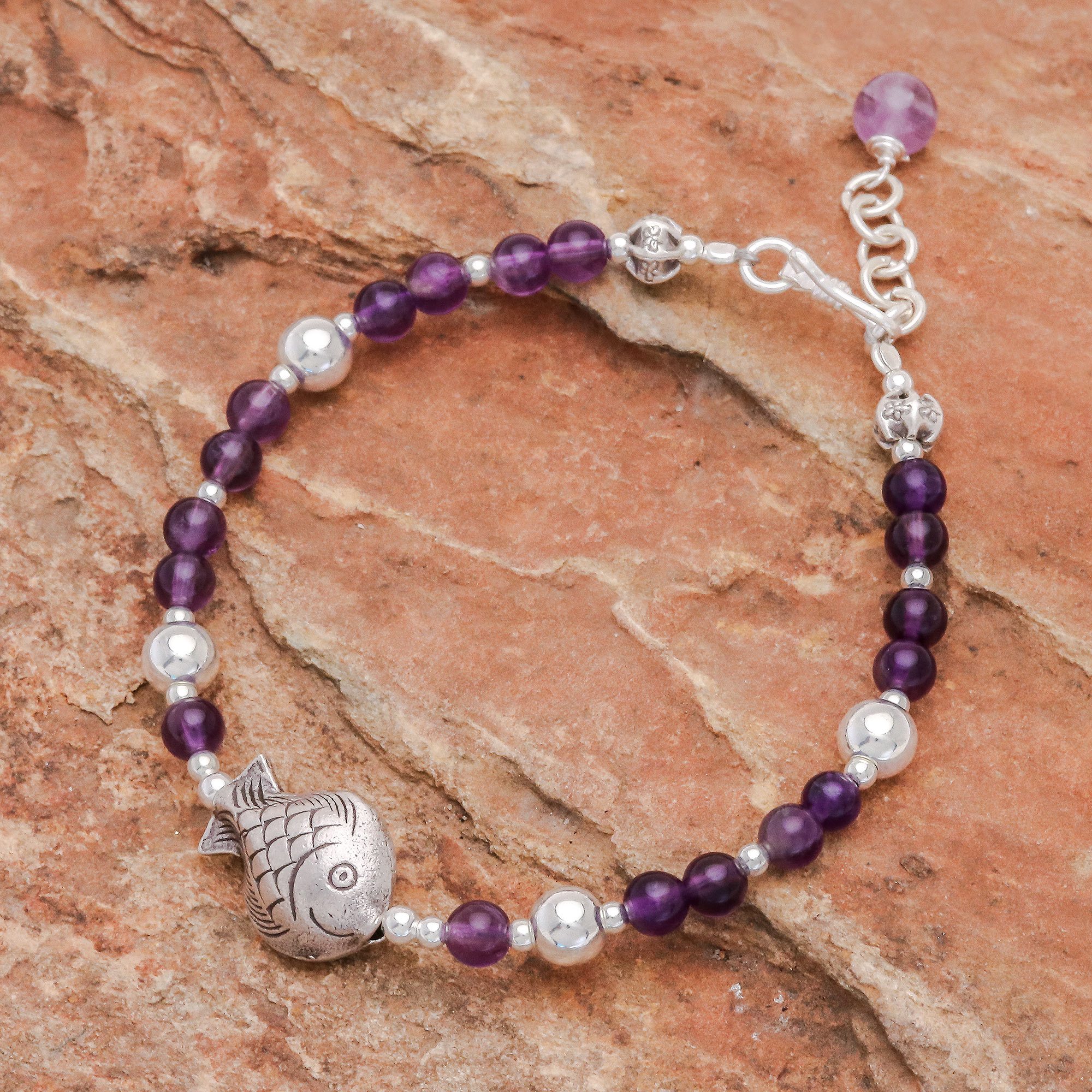 A smiling fish crafted of Karen hill tribe 950 silver adds extra charm to this beaded bracelet from Samart Takham in Thailand. The bracelet features beads of violet amethyst alternating with brightly polished sterling silver beads. The design is completed with a 950 silver hook clasp and extender chain.