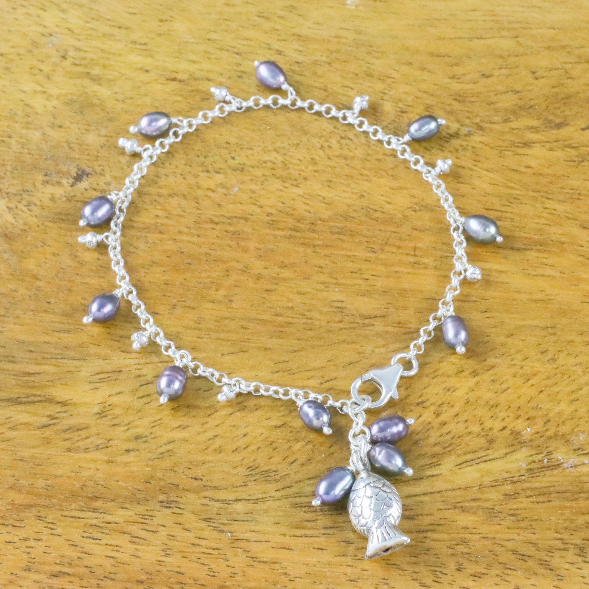Gleaming with the elegance of Karen hill tribe silver, a cute little fish dangles from this Thai bracelet. A sterling silver chain circles the wrist, accentuated with grey cultured pearl and tiny sterling silver baubles. Withaya Cheunjit presents this lovely accessory.