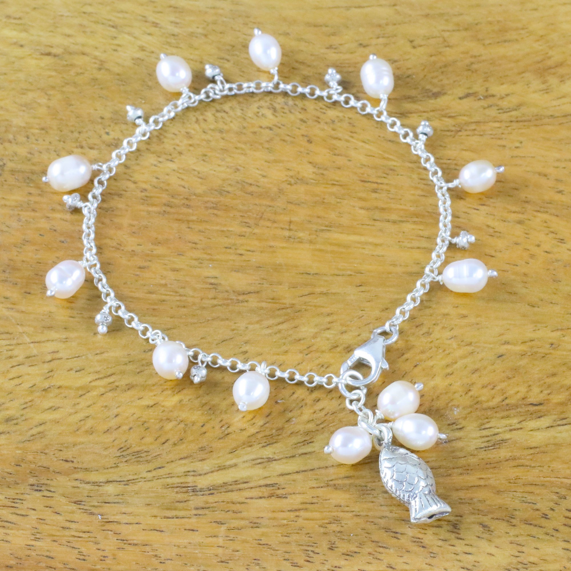 Fish Cultured Pearl Charm Bracelet in White from Thailand, 'Gleaming Fish in White'