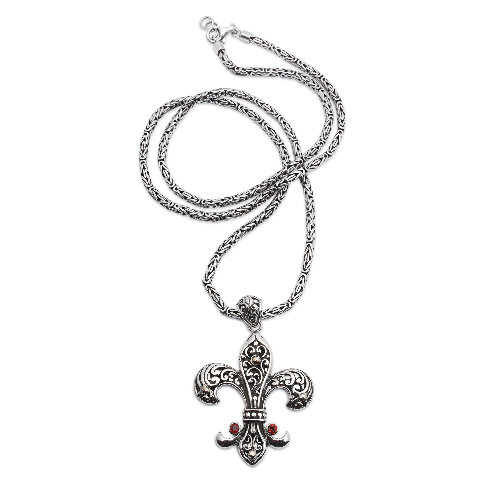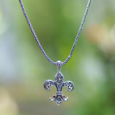 A fleur de lis pendant commands attention with its bold architectural presence, suspended from an impressive Borobudur chain that mirrors the grandeur of Indonesia's ancient temples. Dewi Putera weaves intricate swirling patterns throughout this sterling silver design, creating a mesmerizing labyrinth of curves that flow seamlessly into one another. Tiny garnets nestle within the metalwork like drops of crystallized wine while delicate gold plating accents create warm highlights against the cool silver foundation, transforming this long pendant necklace into a statement piece that never goes unnoticed.