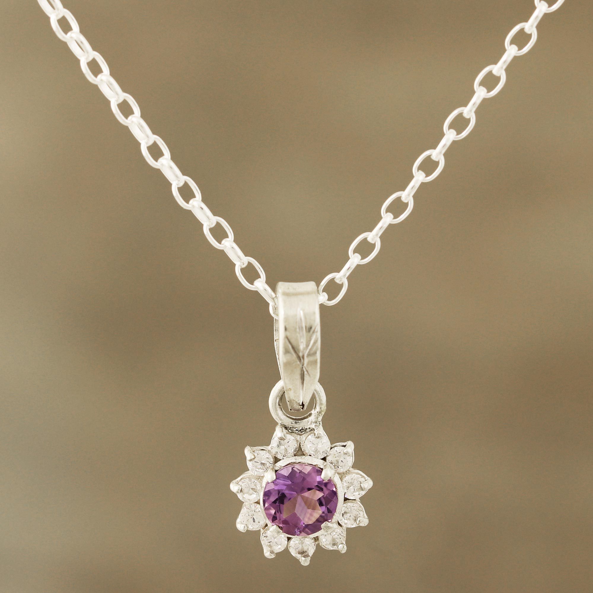 Floral Amethyst Pendant Necklace Crafted in India, 'Gleaming Flower'