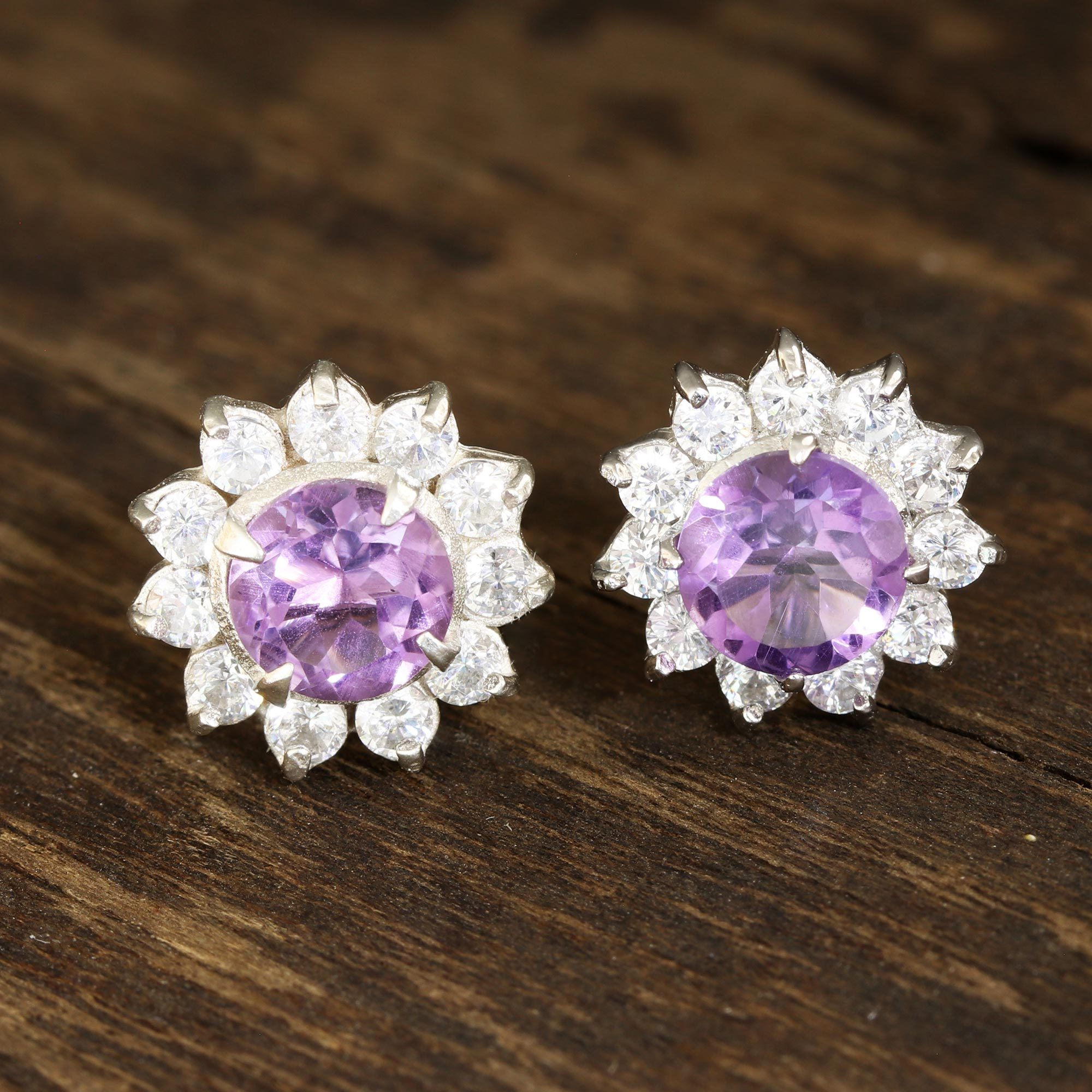 Glittering cubic zirconia petals surround dazzling amethyst gems in these stud earrings from Alok Jain. Seated in sterling silver, the studs are beautiful blossoms that add color and shine to any ensemble.