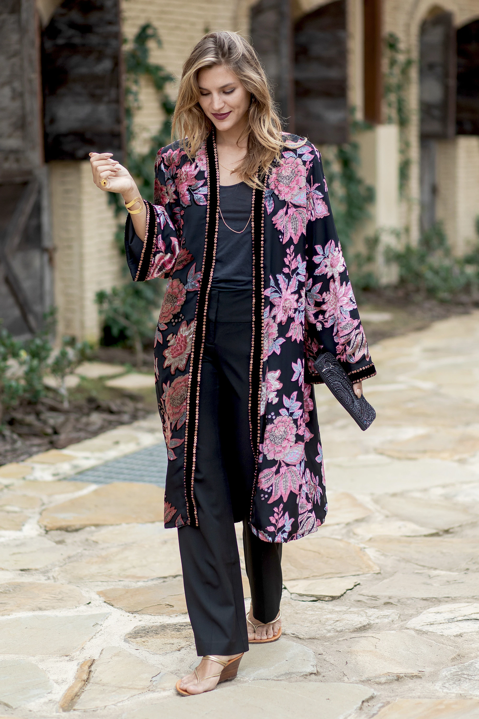 Floral and Leaf-Themed Kimono Jacket with Sequin Embroidery, 'Stylish Symphony'
