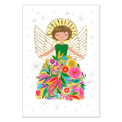 Graceful and full of color, this heavenly holiday card features a serene angel adorned in a vibrant floral gown with swirling patterns. Inside greeting "Joy to you...and all the world!"