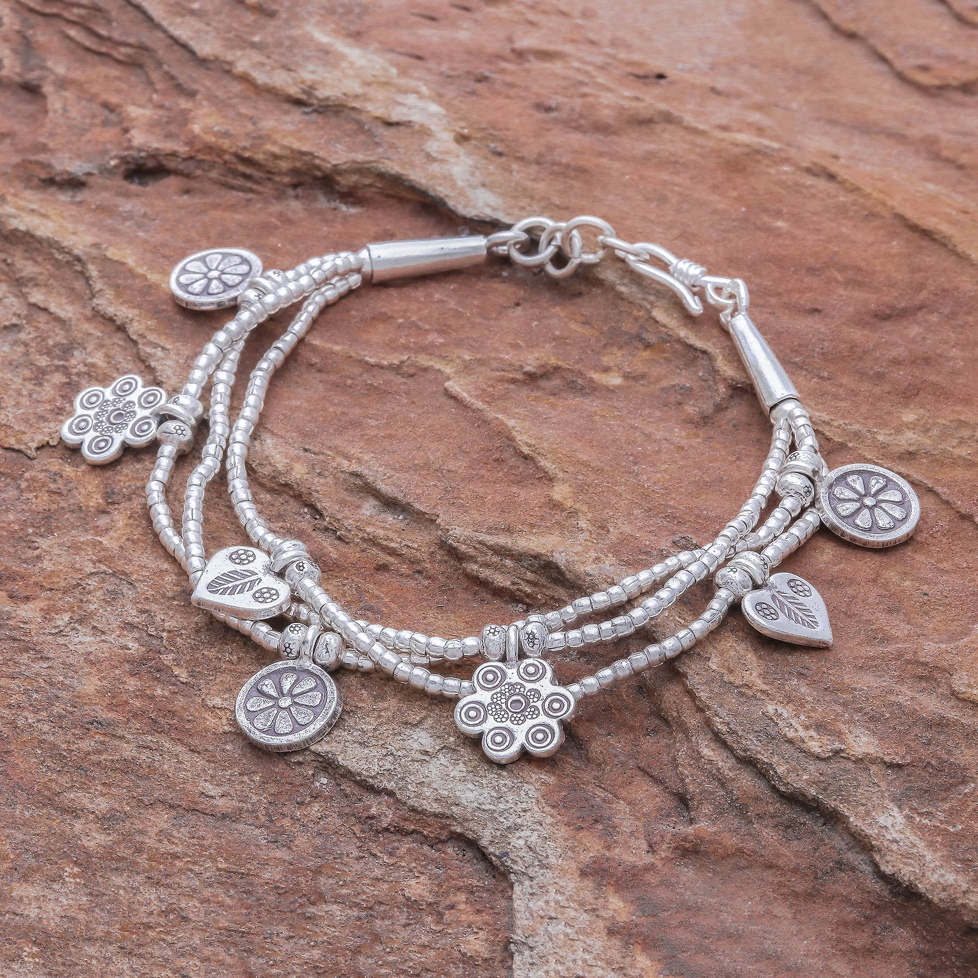 Floral Charm Karen Silver Beaded Bracelet from Thailand, 'Dainty Garden'
