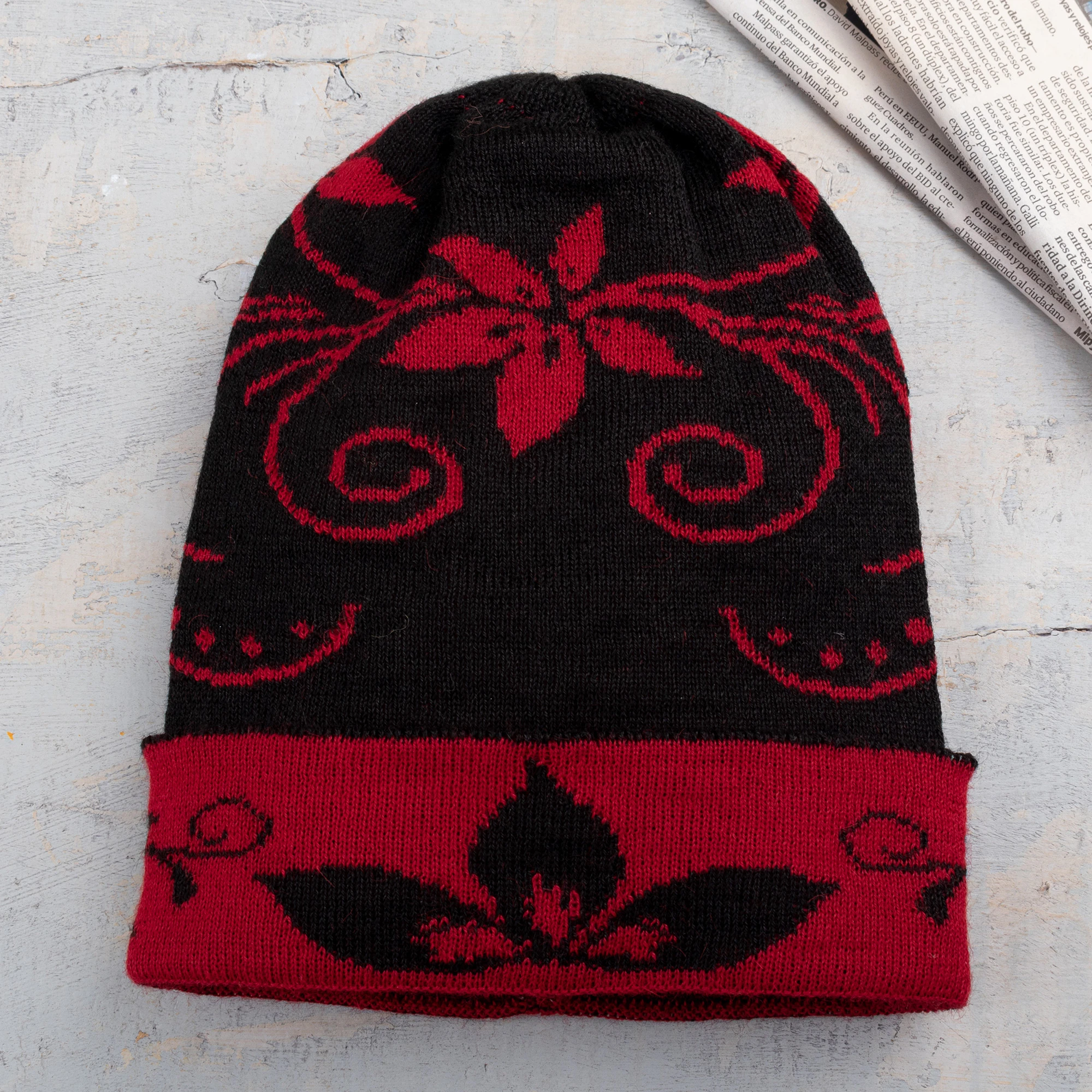 Floral Crimson and Black Alpaca Blend Hat with Soft Texture, 'Crimson Blossom'