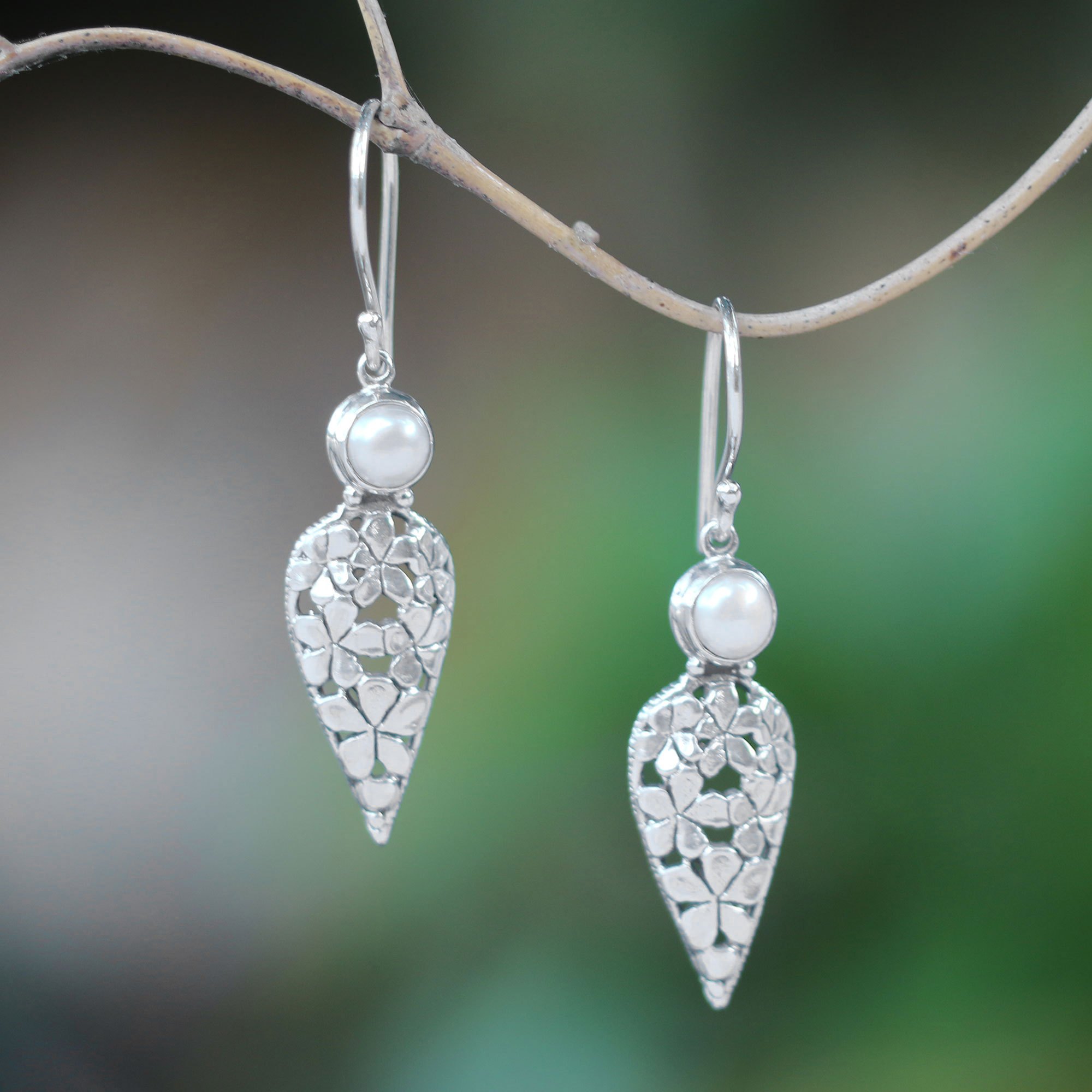 Floral Cultured Pearl Dangle Earrings Crafted in Bali, 'Jepun Blades'