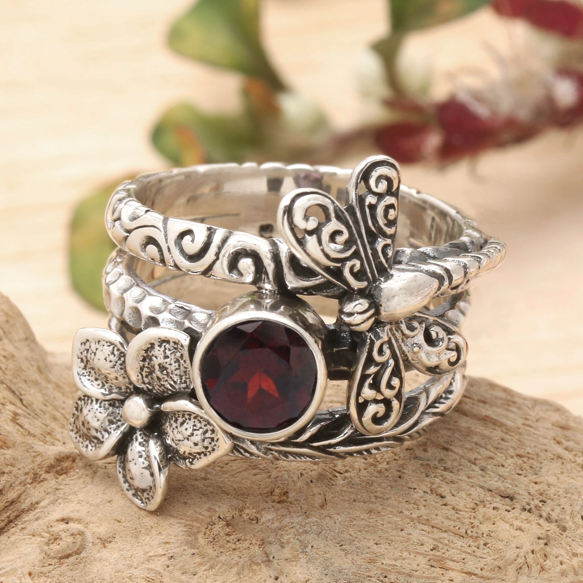 Experience the oneiric sensations of a dragonfly's transformation with this sublime creation from Bali. Artisan Any showcases talent and expert eye in this sterling silver cocktail ring, whose classic accents are complemented by frangipani details and dragonfly accents. As a touch of mystic beauty, a faceted garnet jewel crowns the piece with a red hue of passion.