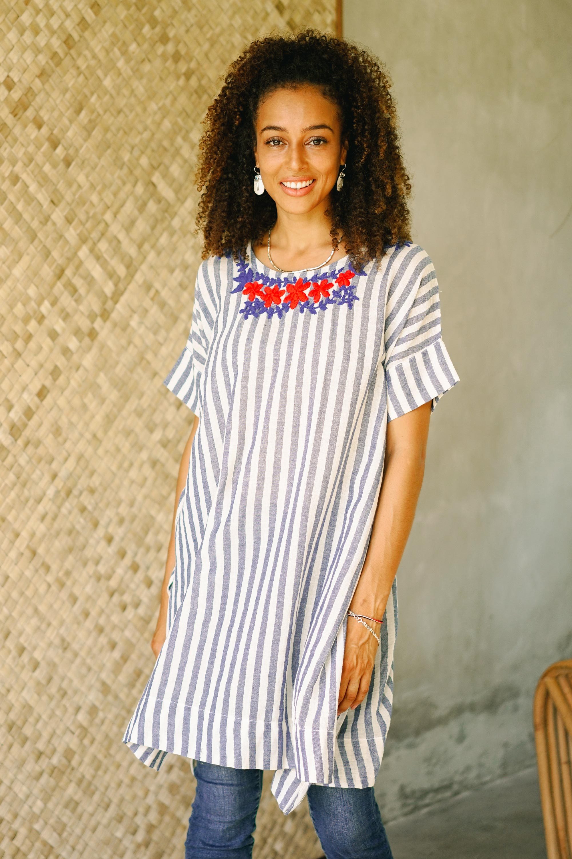 Floral Embroidered Striped Cotton Long Length Tunic, 'Sky Flora'