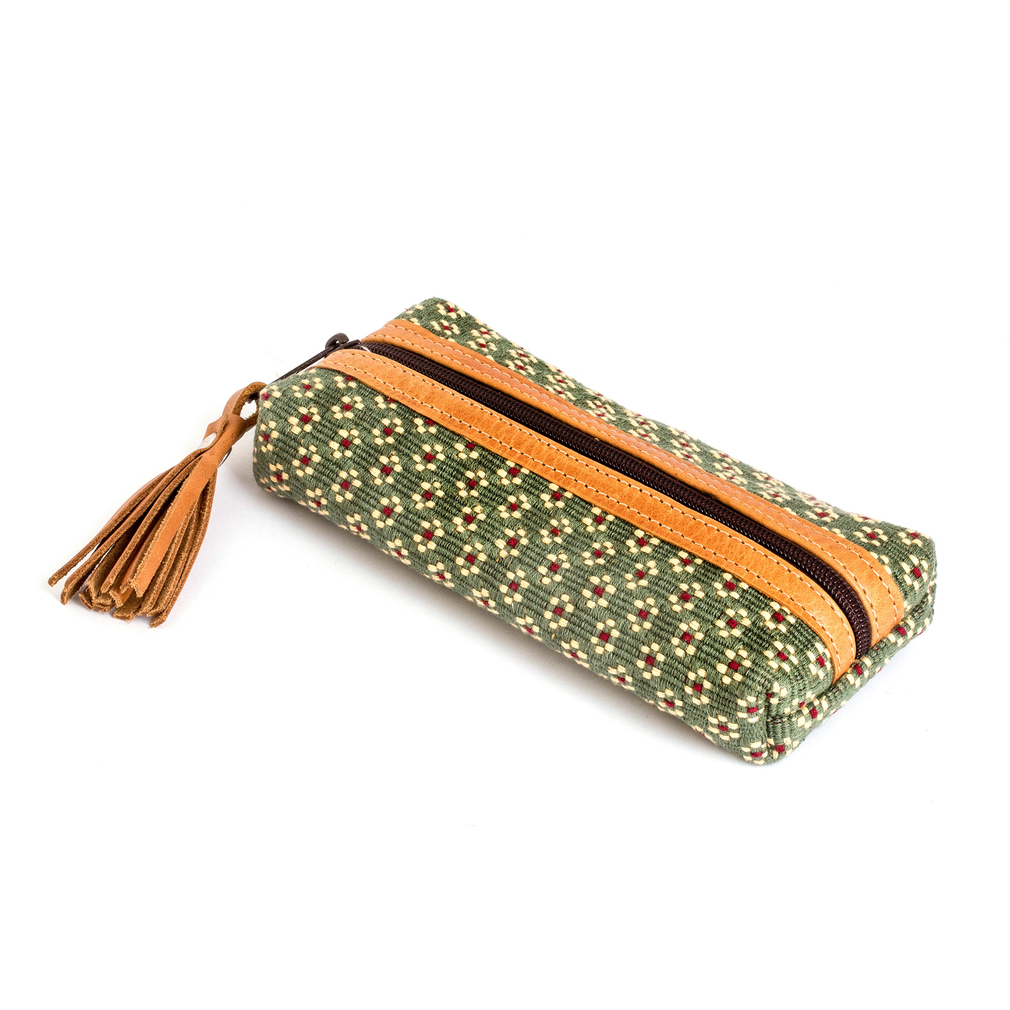 Spring awakens in this pencil case, ideal for keeping your writing or cosmetic tools organized with ease. Laura Leticia Burrion of Guatemala designs the case, which is woven from cotton on a traditional loom and trimmed with tan leather. The bag is fully lined in polyester and closes with a zipper, letting its green flower pattern seal securely.