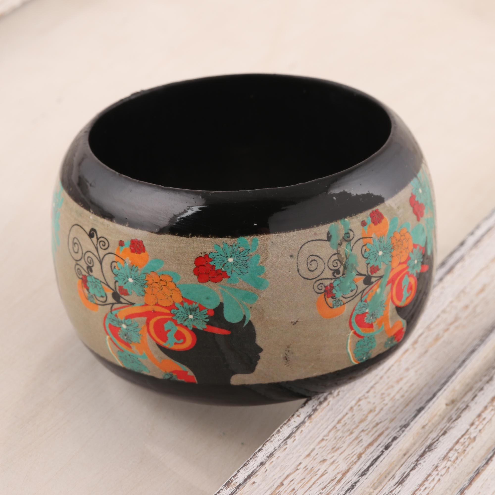 Between bands of black, lovely floral motifs are printed onto this rounded bangle bracelet from India. Vipin presents this bracelet, which is made of haldu wood.