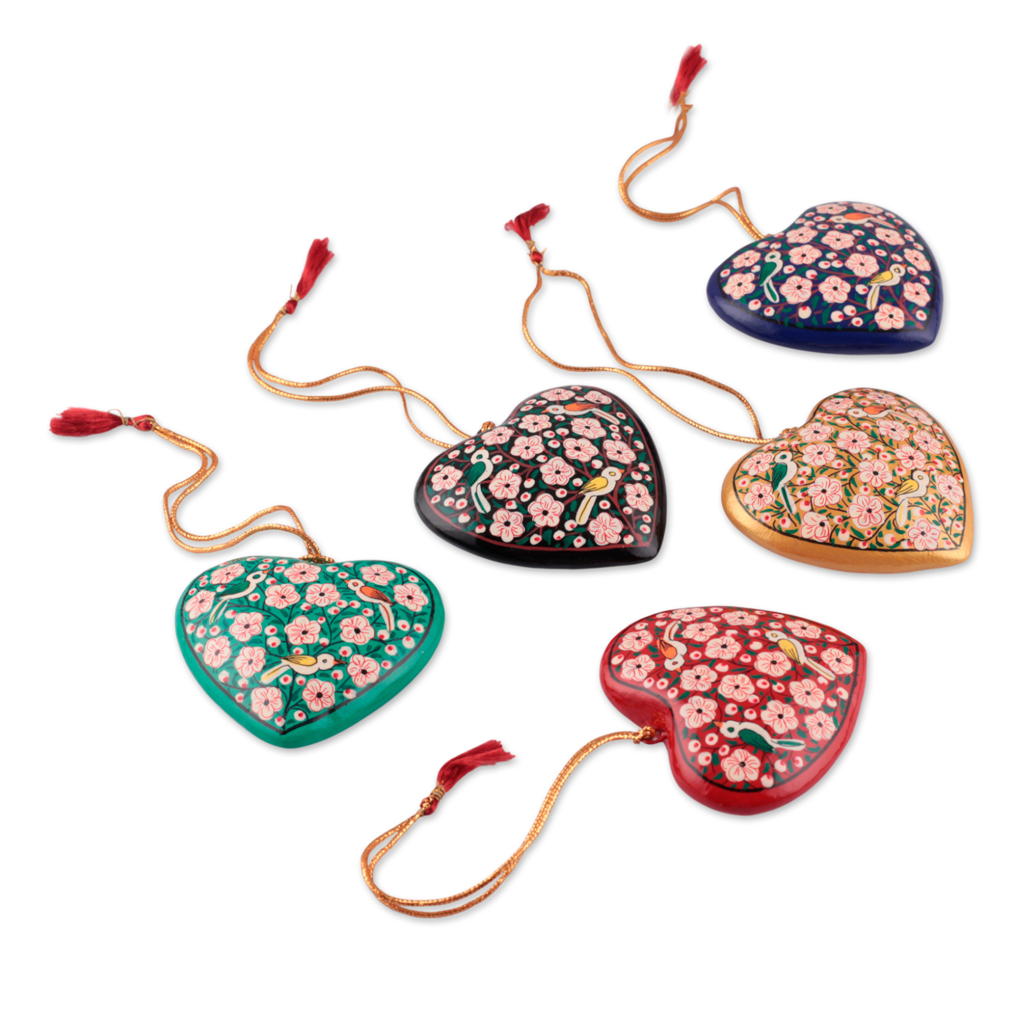 Little hearts fly along the beauty of Kashmir's artistry. Fida Hussain works with papier mache to craft this set of five ornaments, modeled as multicolor hearts in which hand-painted flowers and birds thrive. Each ornament has a golden cord, making the set ideal for several decor themes.