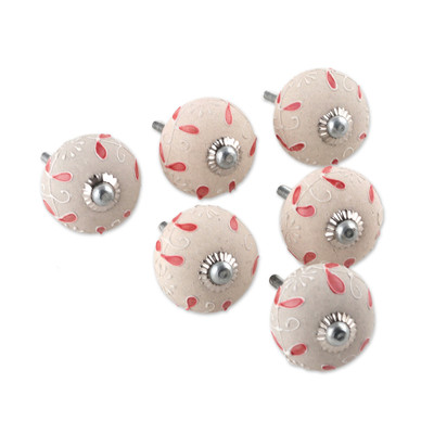 Floral Hand-Painted Beige and Red 6-Piece Ceramic Knob Set, 'Floral Memories'