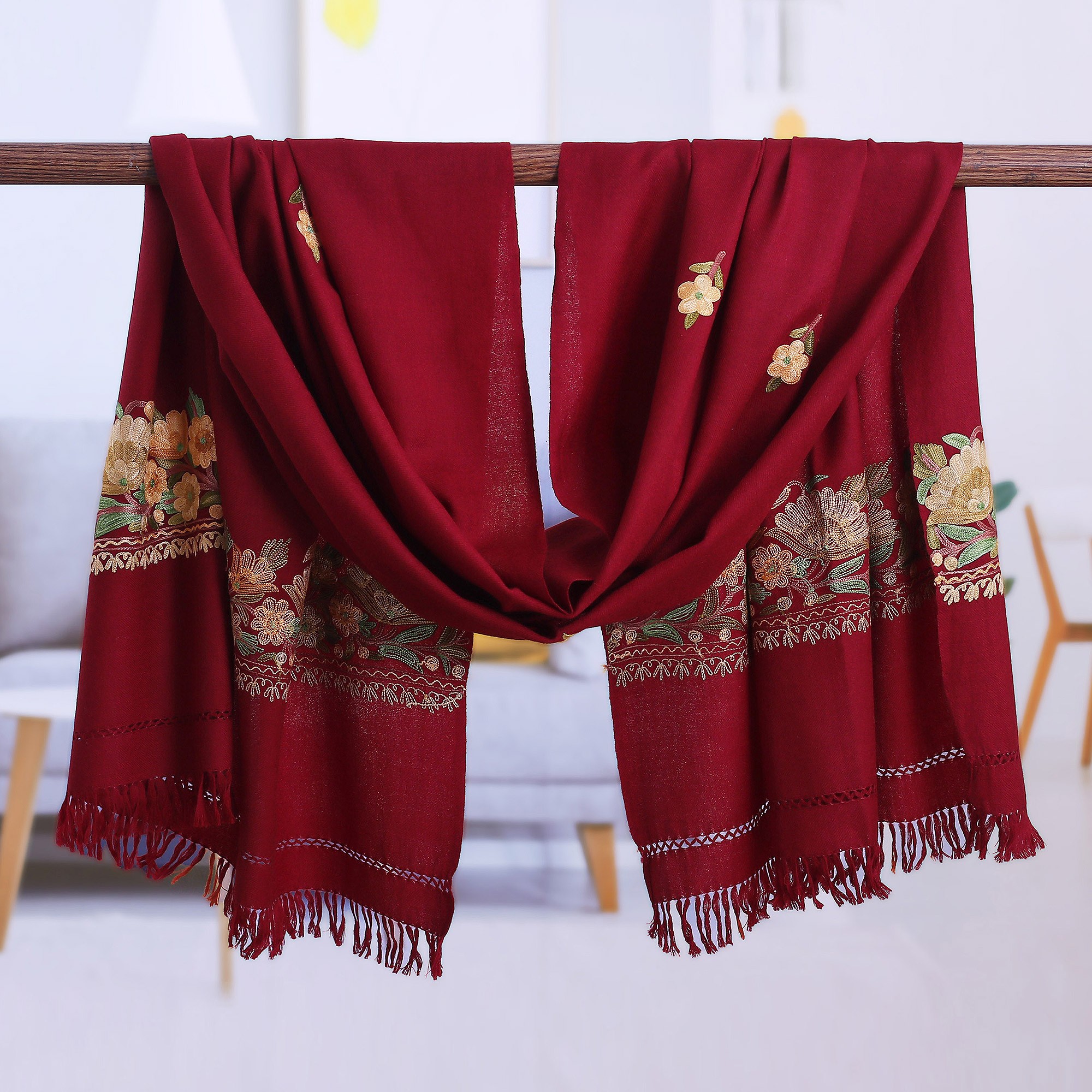Floral Handwoven Wool and Rayon Embroidered Berry Shawl, 'Garden of Berry'