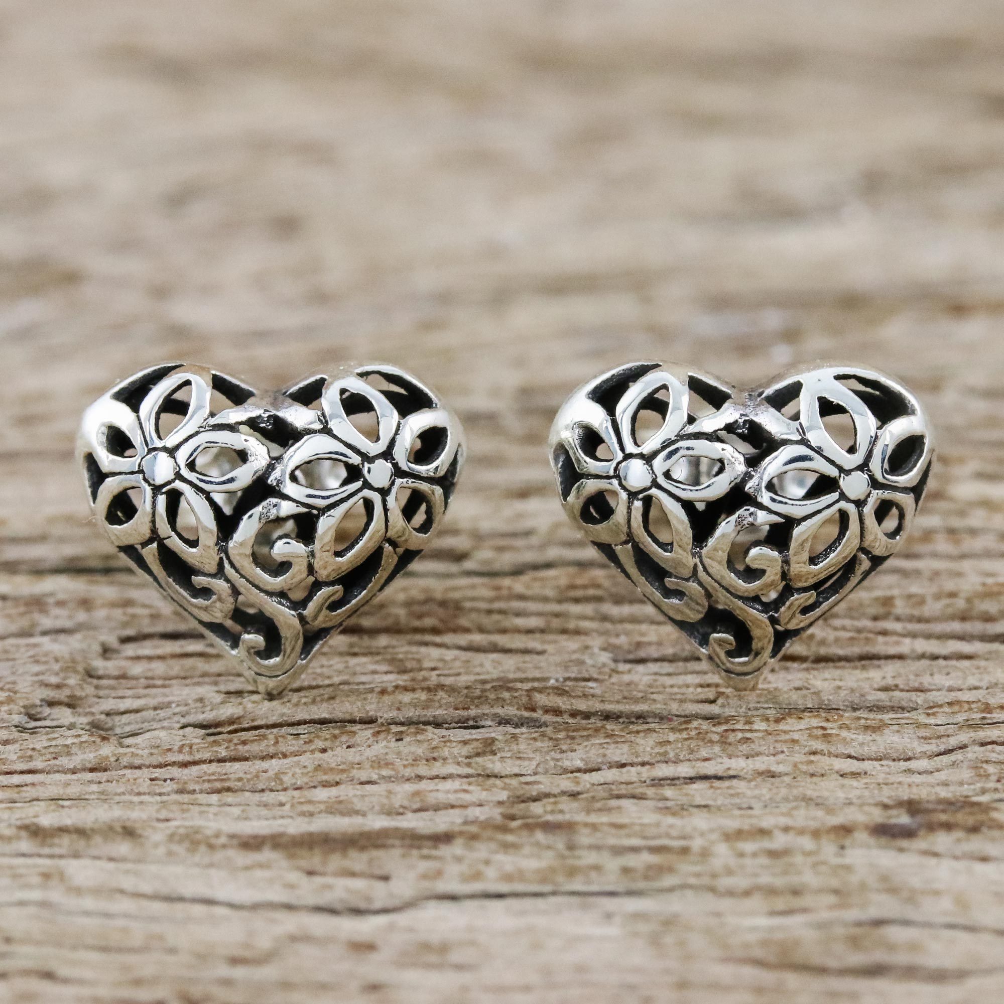 Decorated with elaborate openwork that forms petaled flowers, two hearts are crafted of sterling silver and accentuated with a combination of finishes that catches the eye. Presented by Wadarat Supasirisuk, these stud earrings are a testament to the beauty of Thai handicrafts.