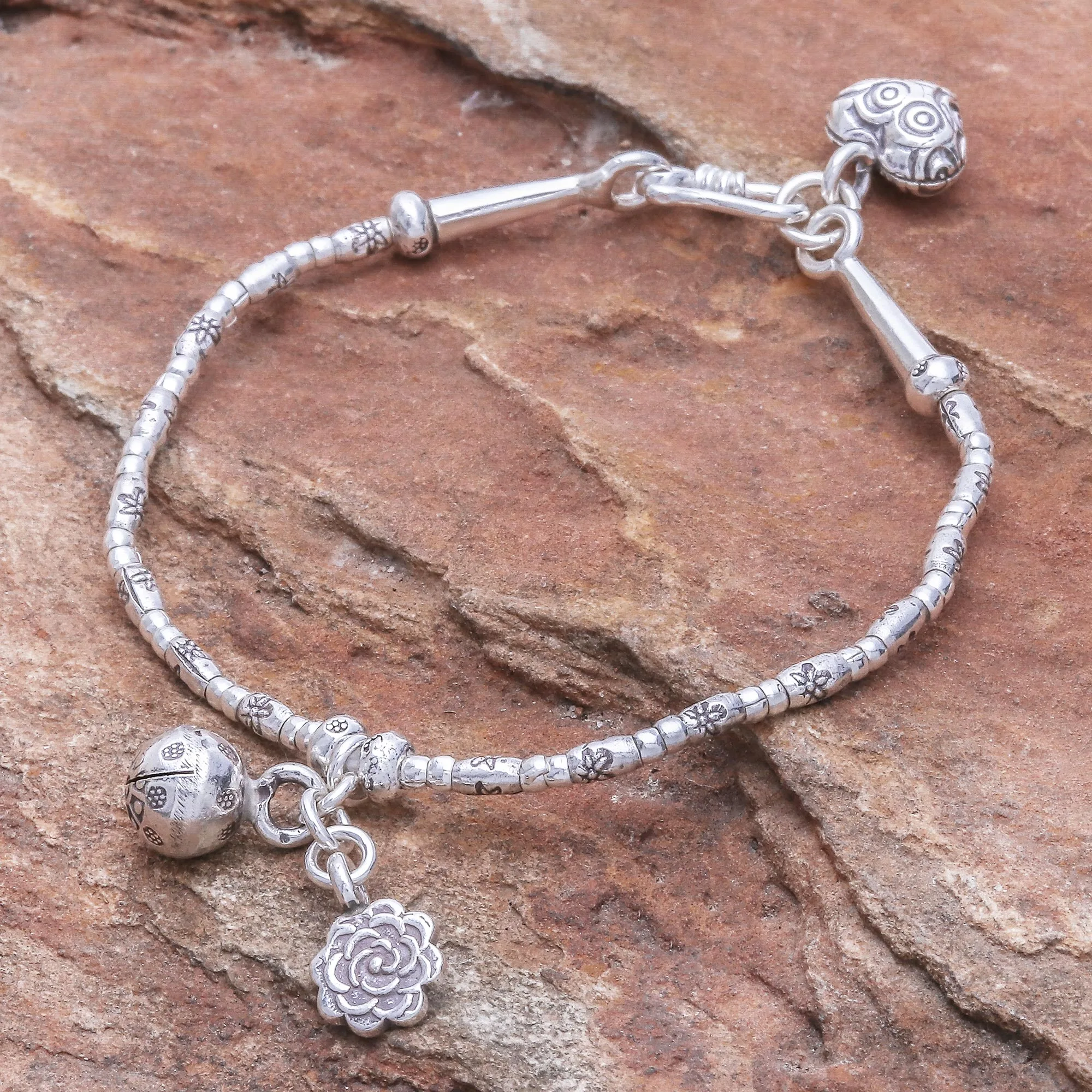 Stamped with oxidized floral motifs, handcrafted 950 silver beads circle the wrist. Thailand's Pakaon Sojintarit presents this bracelet, which is created by Karen hill tribe artisans. A rose flower and ringing bell charm dangle from this bracelet, which is further accented with a heart-shaped charm that swings from the clasp.