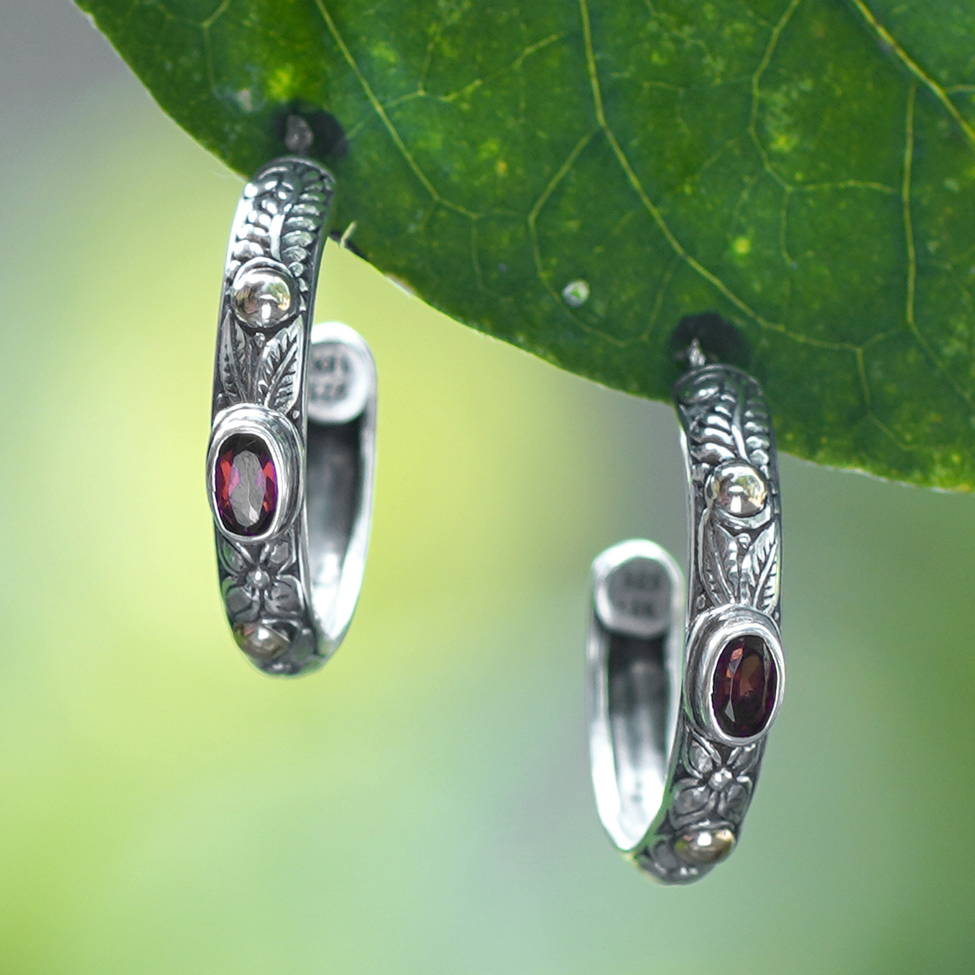 These half-hoop earrings showcase the ancient artistry of Bali in miniature form, where sterling silver curves embrace traditional floral and leaf motifs that have graced the island's temples for centuries. Dewi Putera masterfully combines textured finishes that play with shadow and light while carefully selected garnet gemstones punctuate the design like tiny jeweled windows. The subtle kiss of 18k gold plating transforms each piece into a harmonious dance between cool silver and warm golden accents, creating earrings that whisper tales of Indonesian craftsmanship.