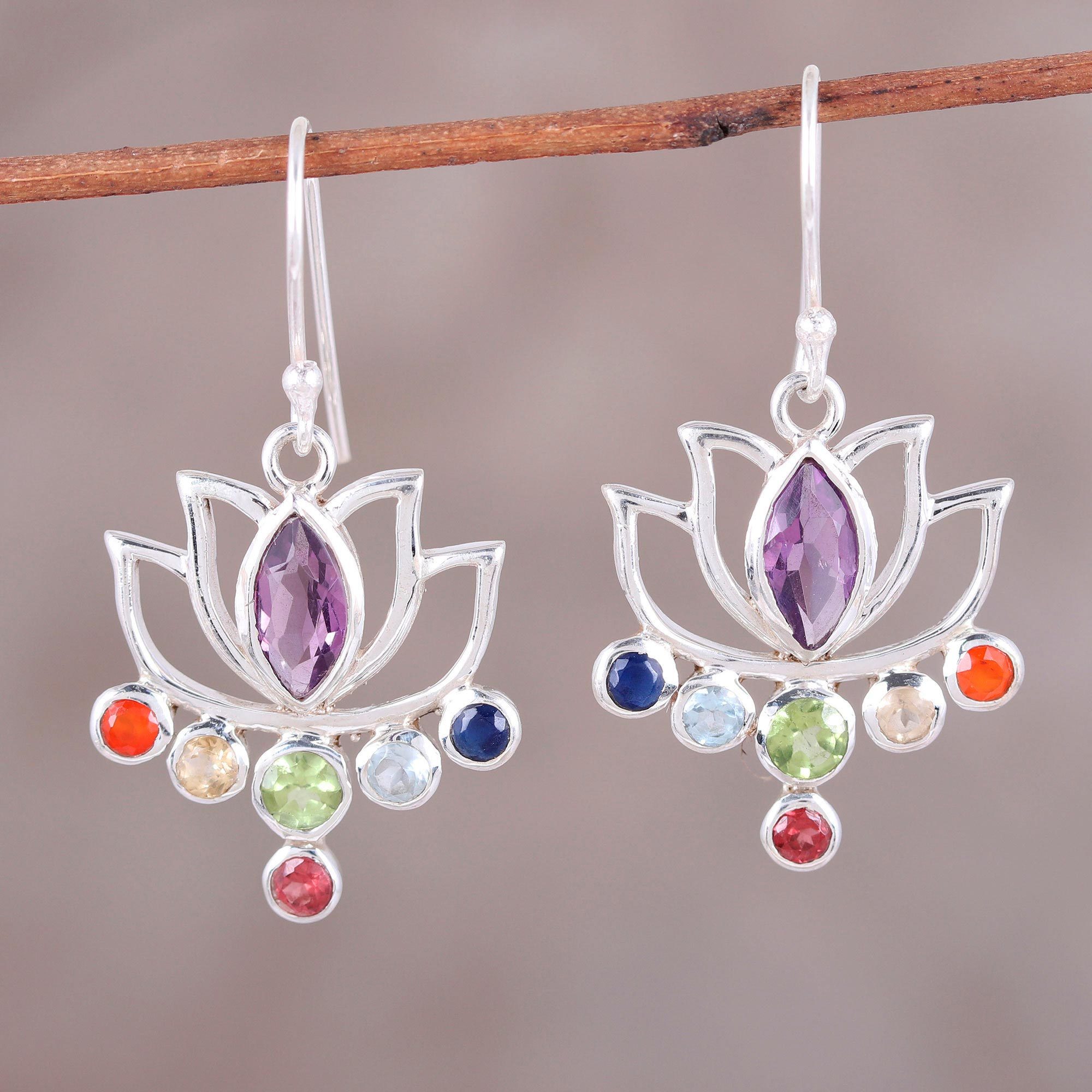 Representing the seven chakras, or energies of the body, faceted gemstones of carnelian, citrine, peridot, blue topaz, sapphire, and garnet accentuate marquise amethysts, totaling 4.5 carats altogether. Chintan presents these Indian dangle earrings, crafted with high-polish sterling silver openwork in the shape of lovely lotus flowers.