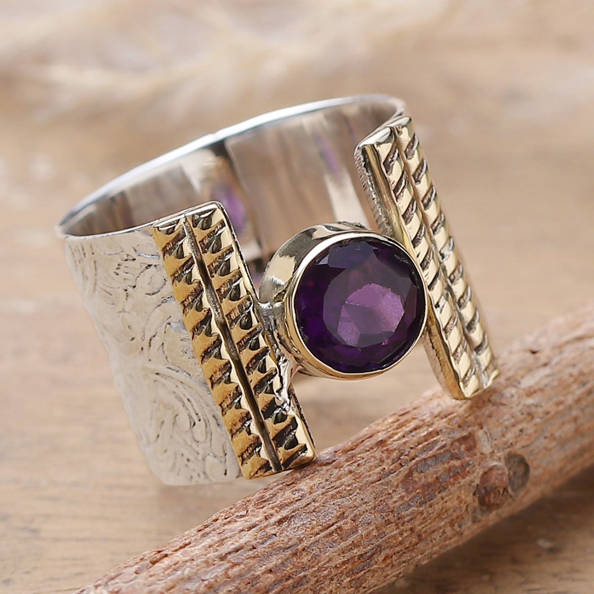The distinguished side of the Indian region changes form in the hands of designer Arpita Sharma. Sterling silver and brass accents compose this gorgeous single stone ring, whose band showcases embossed floral details of refined beauty. A one-carat amethyst stone crowns the front, spreading an aura of wisdom.