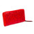 Working in a time-honored artisanal tradition, Mexican artisans Paulina and Maria Jose create this lovely wallet. Crafted from crimson leather, this clutch-style wallet features intricate floral patterns that are carefully tooled by hand. It opens with a zipper to a polyester-reinforced interior that is divided into two compartments via a zipper pocket. This wallet is completed by interior card slots and slots for paper bills.
