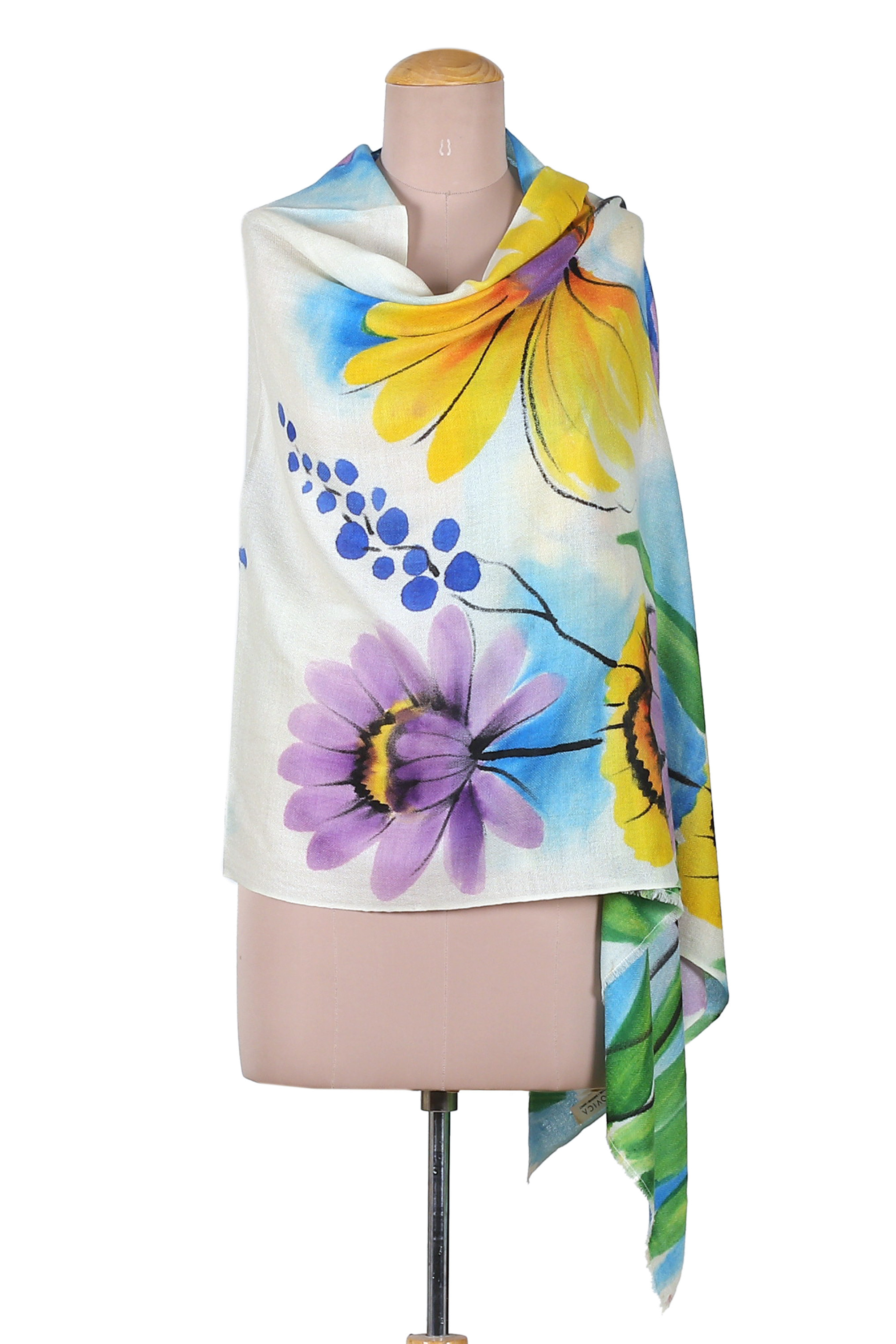 Enjoy spring for eternity with this hand-painted creation by India's Shuja Ahmed. A palette of bright hues paints this wool and silk shawl, adding a graceful floral scene to its lightweight drape, perfect for a nature-inspired fashion statement.