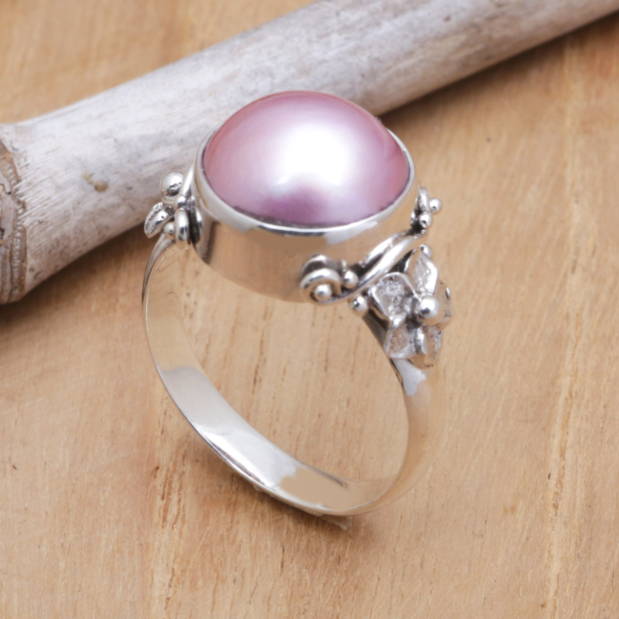 Crowned by an orb of cultured pearl with soft, dyed pink hues, this Balinese cocktail ring brings a sweet beauty wherever it goes. Designed by Buana, the band is handcrafted of sterling silver with jepun, or frangipani flowers that flank the pearl.