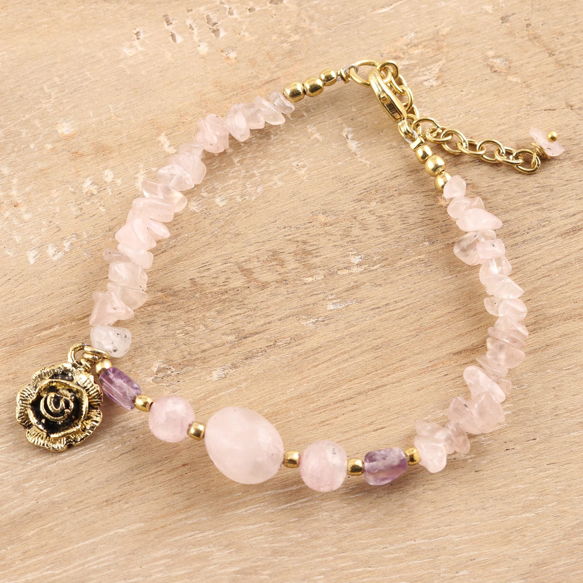 Interspersed with brass, pink and purple quartz beads circle the wrist. Indian artisan Sabir creates this appealing bracelet, which features a dangling floral charm in brass. A brass extender completes this accessory.